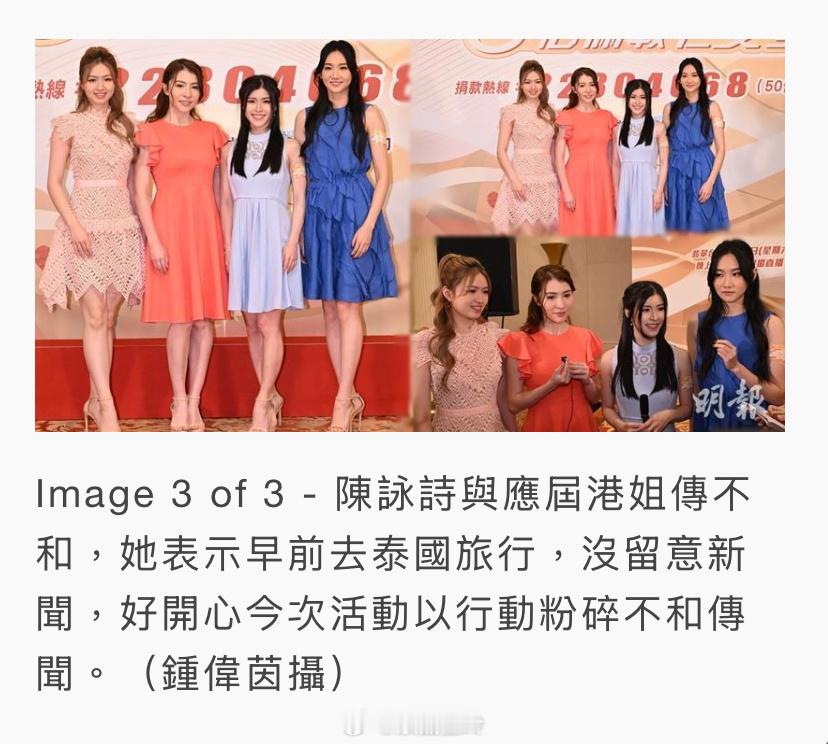 陳詠詩與應屆港姐傳不和,她表示早前去泰國旅行,沒留意新聞,好開心今次活動一致以行動粉碎不和傳聞:「讓大家見證港姐合體融洽相處。」施宇琪闢謠:「我不是會與人不和的人。」 李尹嫣附和:「我們有傾有講,怎會似不和呢?」三甲港姐又透露將會參與籌款騷遊戲環節,陳詠詩相信會帶出喜感,施宇琪笑稱:「又考驗我手腳協調,不過我沒包袱,最醜的一面已在選港姐時曝光 ,今次不用著泳衣、節食,很容易接受。」