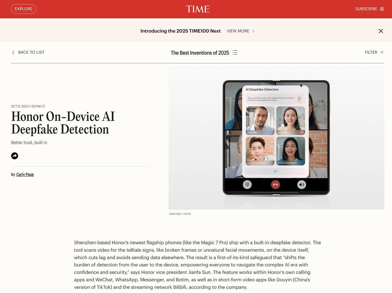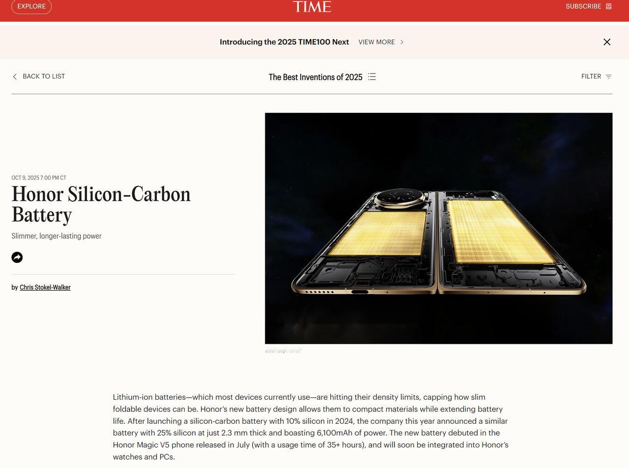 2025最佳发明主榜,一次还拿俩! 凭借青海湖刀片电池 + 端侧AI换脸检测,强势包揽《时代周刊》2025全球最佳发明主榜双奖,成为今年唯一入选的中国品牌,也是消费电子行业独苗! 据悉荣耀青海湖刀片电池是行业首款25%高硅负极,3.x mm超薄折叠级体积。 端侧AI换脸检测,视频通话、直播、社交秒级预警 ⇒ AI造假时代,安全感一键拉满。 荣耀这两项,一个解决“电量刚需”,一个守护“数字身份”,荣耀这波直接把用户体验写进全球科技史。中国智造,实至名归! 荣耀斩获两项2025年最佳发明