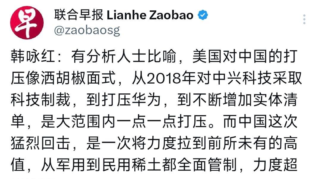 新加坡联合早报10月13日发表韩咏红的评论称:“有分析人士比喻,美国对中国的打压像洒胡椒面式,从2018年对中兴科技采取科技制裁,到打压华为,到不断增加实体清单,是大范围内一点一点打压。而中国这次猛烈回击,是一次将力度拉到前所未有的高值,从军用到民用稀土都全面管制,力度超出意料。” [机智]评几句:美国此前肆意妄为,用光刻机、芯片和关税对中国“卡脖子”,妄图遏制中国发展,其打压手段如洒胡椒面般,东一榔头西一棒子,虽范围广却难有致命杀伤。而中国此次以稀土为武器展开猛烈回击,绝非偶然之举,既是深思熟虑后的战略抉择,也是忍无可忍后的致命一击。“伤其十指,不如断其一指”,中国全面管制从军用到民用的稀土,这一举措直击美国命门。稀土作为众多高科技产业不可或缺的关键原材料,广泛应用于美国的军事、电子、新能源等重要领域。中国此举,如同精准截断了美国高科技产业的“血脉”,让其感受到切肤之痛。