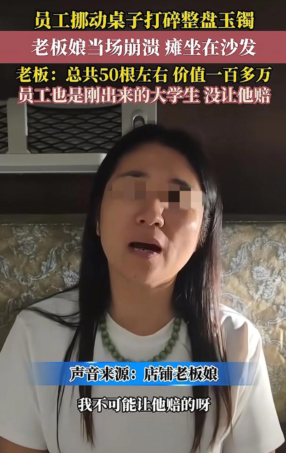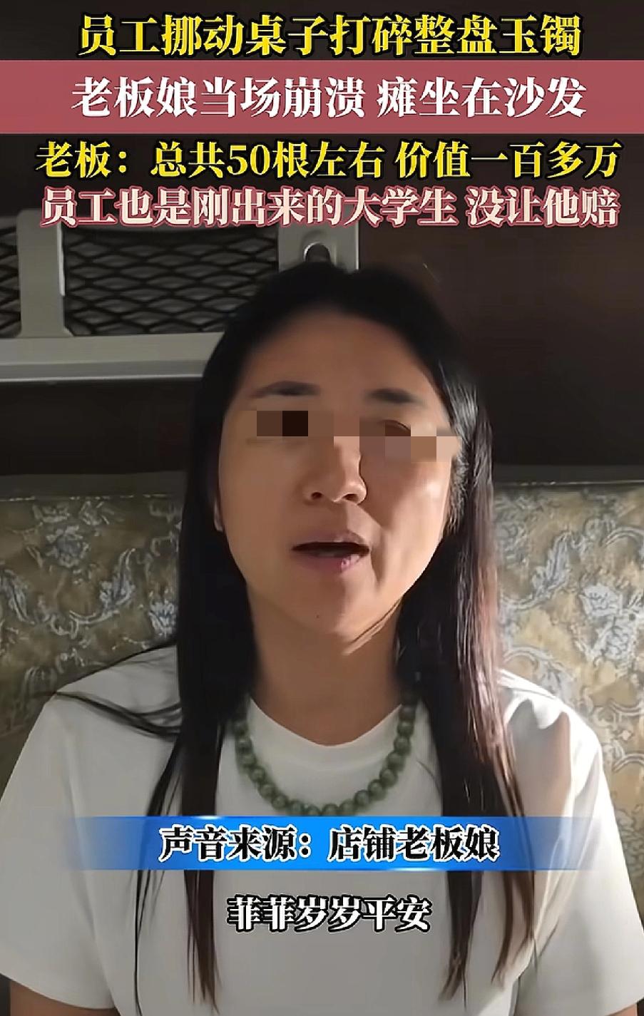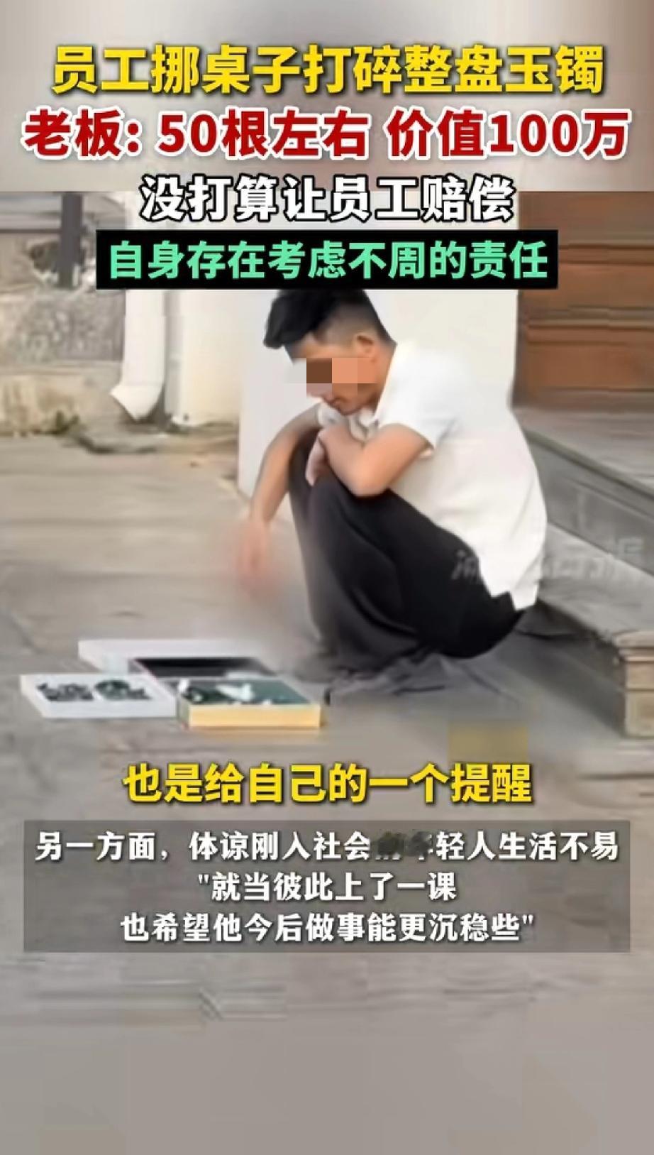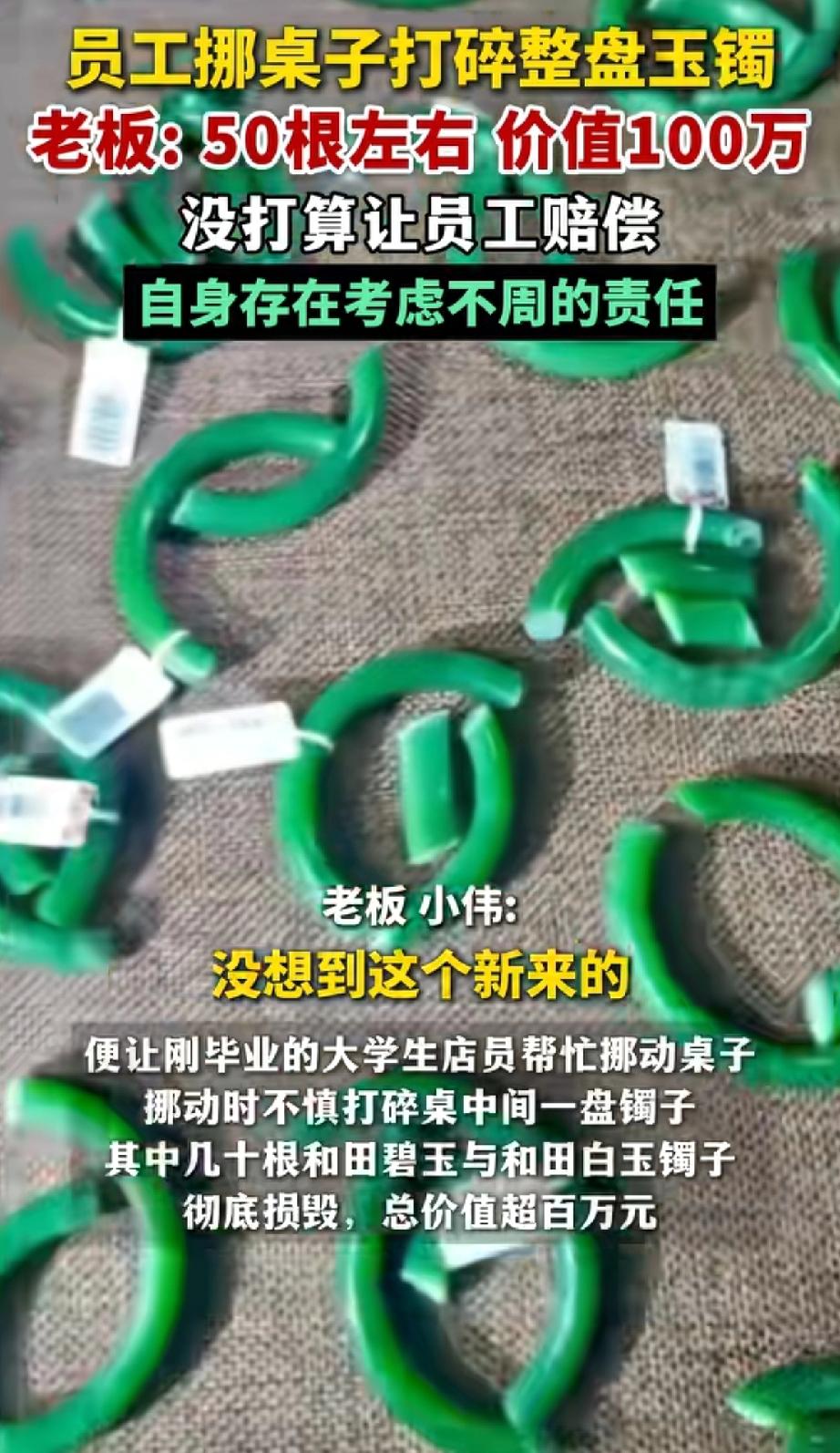 “倒霉妈妈给倒霉开门,倒霉到家了!”江苏苏州一名大学刚毕业不久的男店员,在挪动桌子的时候,结果放在桌边的一盒手镯被打翻到地上,令他没想到的是盒子里面有50根左右玉镯。这可把老板娘急坏了,老板直呼:价值100多万。 不得不说这个男店员太倒霉了吧!本来毕业就还没有攒下什么钱,结果把这么贵重的手镯打碎了,真的是赔不起呀! 没想到的是老板很开明知道他的难处,同时也有自己疏忽的一面,所以决定不让男店员赔偿了。把这碎了的玉镯收在盒子里,警醒自己以后不要再犯这样的错误。 网友热议,有网友说:“不用纠结到底值不值一百多万,没让人孩子赔就是好老板。” 还有网友说:“应该让年轻人少赔一些,让他们长长教训,现在的年轻人毛手毛脚,不懂得承担,应该让他们承担做错事的后果。” 也有网友说:“老板不是一般大气了, 我记得我年轻的时候,去个人加盟奶茶店上班,盖膜没压紧,一杯撒地下了, 工资里扣我一杯奶茶钱。 其实这件事情可以避免,放盒子的时候注意一下位置。店员在挪动桌子的时候也应该仔细观察盒子是不是放在了桌子的边缘。 最好的办法就是在挪动桌子的时候,将上面所有的盒子都放到别的地方去。 大家还有什么好办法吗?对此你怎么看?