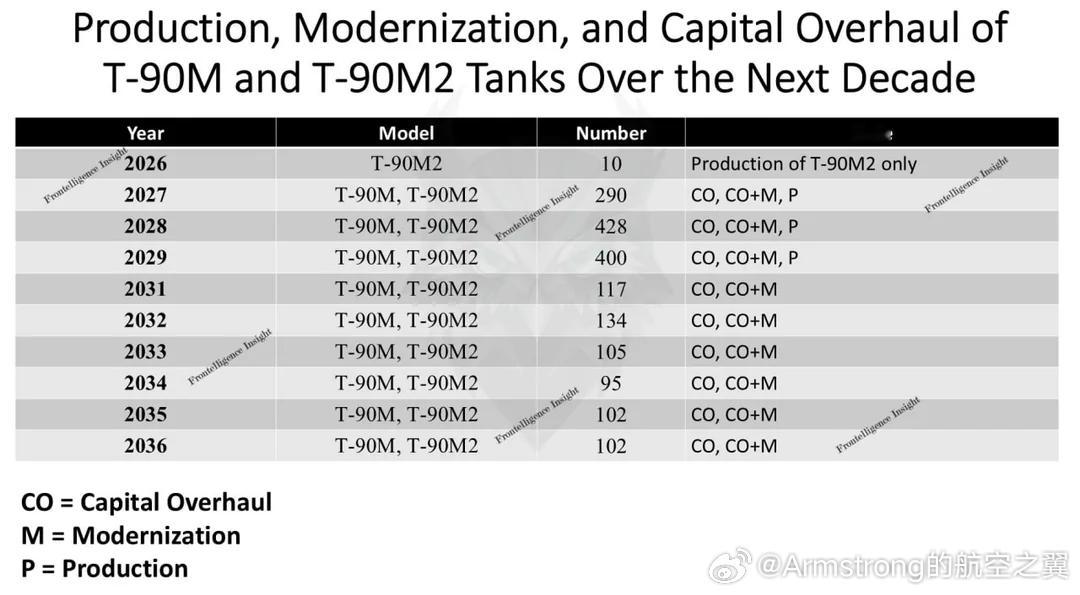 开源情报机构“Frontelligence Insight”称获得俄罗斯未来装甲车辆生产计划,其中乌拉尔机车制造厂(UVZ)将于2026年开始生产T-90M2。新改型将重新设计战斗舱,并解决一个长期存在的问题——改进变速箱并增加倒档。俄乌冲突