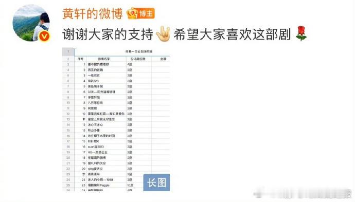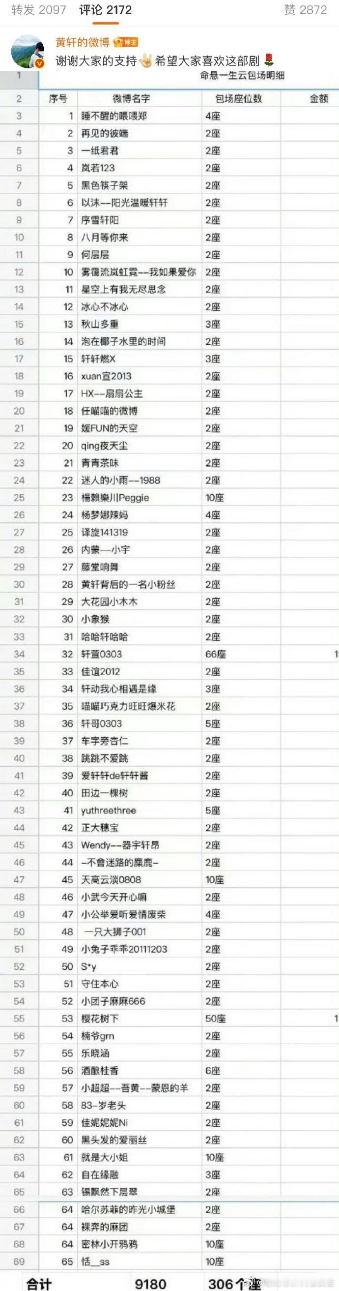 黄轩拉表感谢粉丝支持黄轩发了粉丝云包场明细表 内娱独一份!黄轩制作粉丝云包场表格,65 位支持者 306 座清晰罗列,感谢大家爱这部剧。