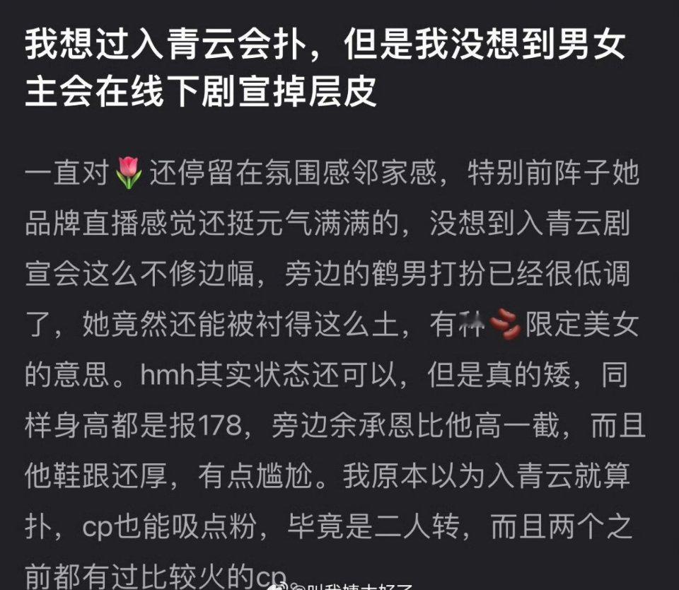 有网友说想过入青云会扑,但没想到男女主会在线下剧宣掉层皮,卢昱晓剧宣看起来不修边幅,线下看着真的很普,旁边的鹤男打扮已经很低调了,她竟然还能被衬得这么土,有种🫘限定美女的意思,侯明昊状态还可以但真的矮,同样身高178,旁边余承恩比他高一截