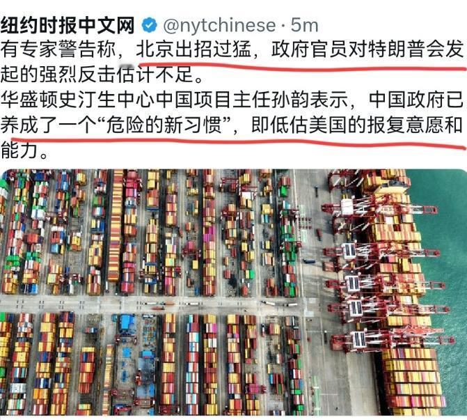 美专家警告,中国已养成了一个危险的新习惯,即低估美国的报复意愿和能力,纽约时报今天刊文,表示中国的出手表明,中国认为自己非常的自信,而且有实力,谁料美媒话锋一转援引专家观点表示,中国应该担心的是出招过猛,政府官员对特朗普会发起的强烈反击估计不足。 中国近年来的各类举措,始终基于自身发展需求与国际规则,不存在所谓 “出招过猛” 的前提。 无论是在经贸领域维护自身权益,还是在科技领域推动自主创新,中国的每一步行动都经过充分评估,兼顾国内发展与国际合作。 中国对美方关税措施的回应,始终遵循 “对等” 原则,针对的是美方单边加税行为,目的是维护全球贸易秩序与自身合法权益,而非主动挑起对抗。 这种回应方式符合国际贸易规则,也为后续沟通保留了空间。 美专家提及的 “低估美国报复意愿”,忽略了中国政策制定中的风险考量。 中国在出台任何涉及国际互动的政策前,都会全面分析可能的外部反应,包括美方的应对措施。 相关部门会通过智库研究、行业调研、国际交流等多种渠道,收集各方信息,评估政策实施后的影响,制定多套应对预案。 这种严谨的决策流程,确保中国的举措既坚定维护自身利益,又避免引发不必要的冲突升级,不存在 “估计不足” 的情况。 特朗普此前的政策风格,确实带有较强的不确定性,但中国对其可能的政策走向始终保持关注。 在特朗普任内,中美经贸摩擦曾经历多轮起伏,中国通过持续对话、灵活应对,在维护自身利益的同时,推动双方达成阶段性共识。 当前美专家的担忧,更多是基于历史经验的推测,而非对中国当前决策机制的客观认知。 中国在应对各类外部变量时,已形成成熟的评估体系,能够根据实际情况调整策略,确保自身利益不受损害。 《纽约时报》刊文中提到的 “中国自信与实力”,本质上是中国多年发展积累的结果。 经济领域,中国连续多年保持全球第二大经济体地位,对世界经济增长贡献率超过 30%。 科技领域,5G、新能源、人工智能等领域的突破,让中国在全球产业链中占据重要位置。 外交领域,中国推动构建人类命运共同体,在多边事务中发挥越来越重要的作用。 这种自信并非盲目,而是建立在实实在在的发展成果之上,也让中国在国际互动中更有底气维护自身权益。 国际合作的大背景下,中美双方的利益交融远大于分歧。 中美互为重要贸易伙伴,2024 年双边贸易额达 6900 亿美元,涉及农产品、能源、电子产品等多个领域,直接影响两国数百万从业者的生计。 科技领域,双方在气候变化、疾病防控等全球性议题上的合作,对人类共同福祉至关重要。 美专家强调的 “报复” 与 “反击”,若真的付诸实践,不仅会损害中国利益,也将对美国国内经济、民生造成负面影响,不符合双方共同利益。 中国始终主张通过对话解决分歧,反对对抗思维。 即便在中美关系面临挑战时,中国也从未关闭沟通大门。近年来,中美在经贸、气候、军事等领域保持多渠道接触,通过高层会晤、工作层磋商等方式,就共同关心的议题交换意见。 这种务实沟通的态度,与美专家担忧的 “低估风险” 形成鲜明对比,也为双方管控分歧、避免冲突提供了保障。 当前,全球面临经济复苏、气候变化、公共卫生等多重挑战,中美作为世界前两大经济体,肩负着重要责任。 双方若能摒弃零和思维,以理性务实的态度开展合作,不仅能推动两国关系健康发展,也将为全球治理贡献力量。 美专家的观点可视为一种风险提示,但中国的决策始终基于客观现实与自身利益,兼顾短期应对与长期发展,不存在所谓 “危险习惯”,而是在复杂国际环境中坚守原则、灵活应对的理性选择。 中美互动仍将面临各类不确定性,但只要双方坚持沟通、尊重彼此核心利益,就有望找到利益契合点,实现互利共赢。 中国的自信与实力,不会转化为对抗的资本,而是推动国际合作、维护全球秩序的动力,这一立场始终清晰且坚定。