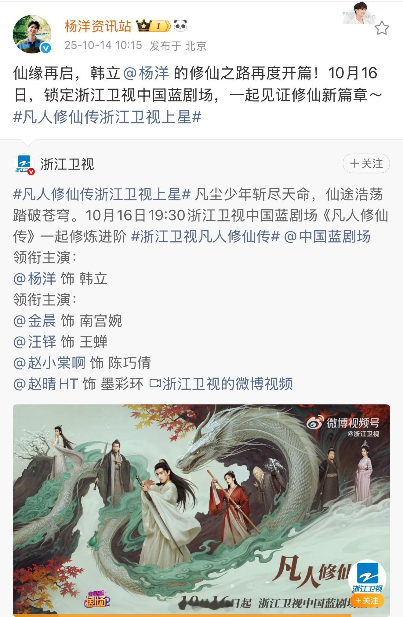 恭喜杨洋凡人修仙传上星浙江卫视黄金档,10月16号再次开启韩立逆天改命之旅!