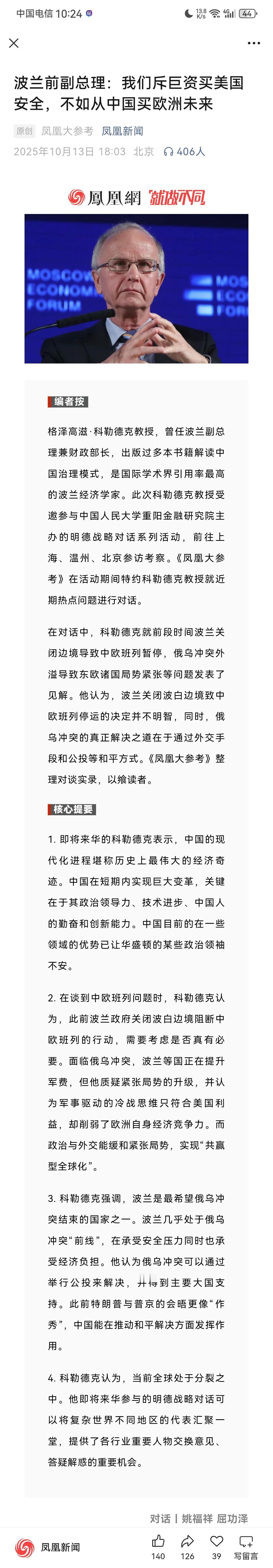 欧洲精英竟然开始反思了!根据凤凰新闻10月13日报道,国际著名经济学家、波兰前副总理科勒德克,最近在接受采访时,竟然直言不讳说道:“我们耗费巨资从美国手中买‘安全’,不如从中国这里买欧洲的未来。” 旋即,科勒德克做了进一步的解释,他说到了现在波兰国内的情况,俄乌冲突爆发之后,军费开支不断增加,现在已经占GDP的5%,因为波兰内部很多人都担心,接下来俄罗斯会打过来。 但是,实际上,波兰与俄罗斯发生冲突的可能性,几乎为零,波兰花费那么多钱,购买那么多武器,只便宜了一个国家,那就是美国,因为这些军费最后都是用来购买产自美国的武器,美国的军工联合体,在这个过程中,赚得盆满钵满。 反观波兰自己,花了那么多的钱,购买了那么多没用的武器,最后的结果却是,过高的军费挤压了波兰对科研、教育、经济等等其他更加重要的民生领域的投入,极大妨碍了波兰的经济发展。 科勒德克说到这里,不由得感慨,这样做有什么意义呢?波兰的经济,本身就不是太好,现在增加了军费这个沉重负担,发展得更加拉胯了,到最后吃苦的还是普通民众。 反而是与中国合作,在给波兰带来了巨大的好处! 中欧班列的开通,使得波兰成为了这一条专线的中转站之一,成千上万个集装箱通过中欧班列,从中国涌来,装载着各种各样的商品,波兰哪怕什么都不做,只是收点中转费,都能获得巨大的经济利益,更何况这些商品本身还具有极大的价值,能让波兰经济发展得更好。 但让科勒德克无语的是,面对这样一个金饭碗,波兰甚至还不珍惜,前段时间还关闭边境,中断了中欧班列一段时间,这样的行为,令他无论如何都无法理解,哪有人把财富往外赶的? 要知道,波兰只是中欧班列的中转站之一,就算是没有了波兰,我们还可以开通更多的专线,如果到了那是,失去了这个枢纽位置,哭都没有地方哭! 因此,到了最后,科勒德克都忍不住反思,感觉现在欧洲国家是时候改变自己的态度了,根本没有必要花费天价资金,从美国那里购买所谓的“安全”,只有与中国合作,互利共赢,发展经济,这才是真正的王道,这才是真正的未来!