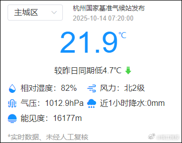 记者打开天气预报,早上7点20的实时气温显示杭州主城区还不到22度。