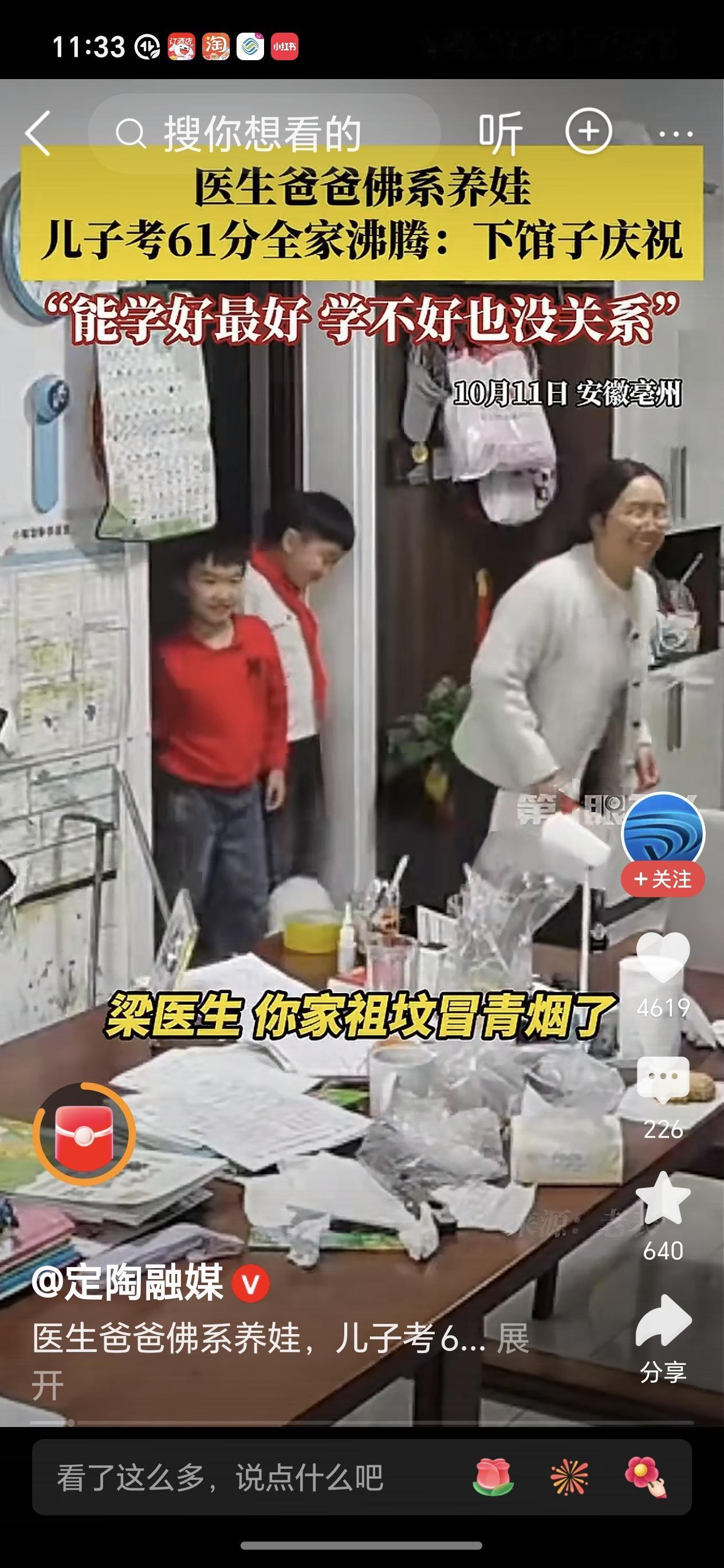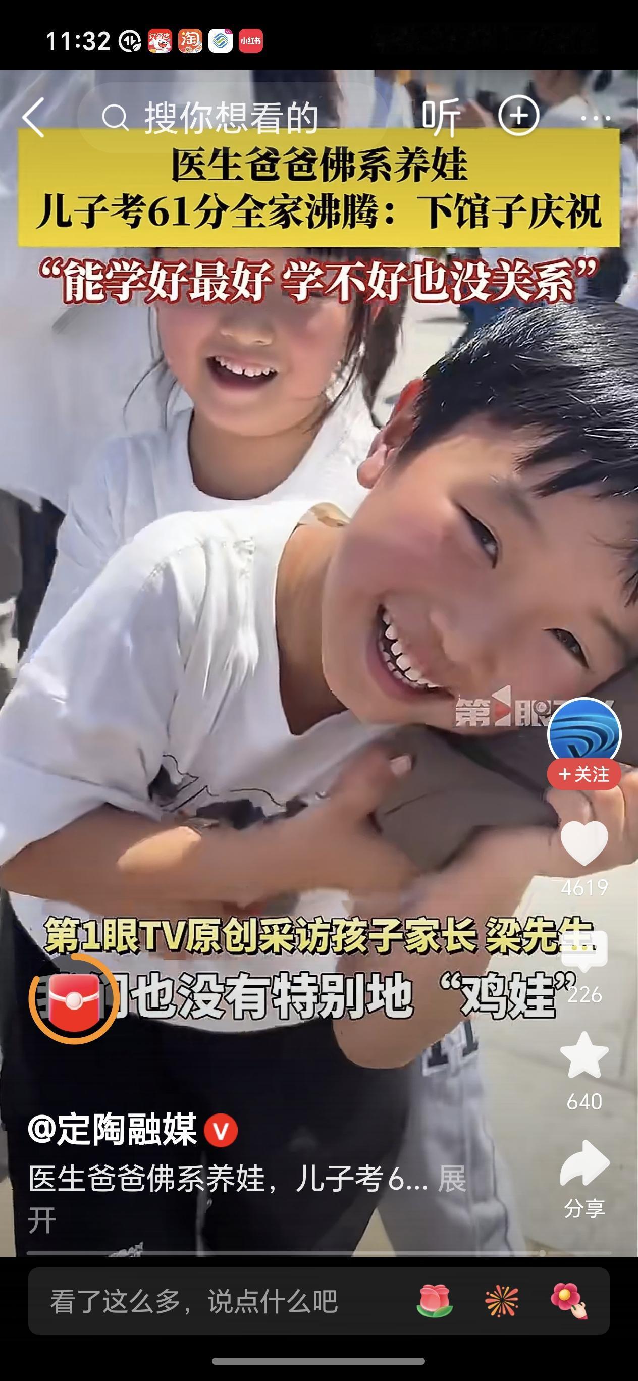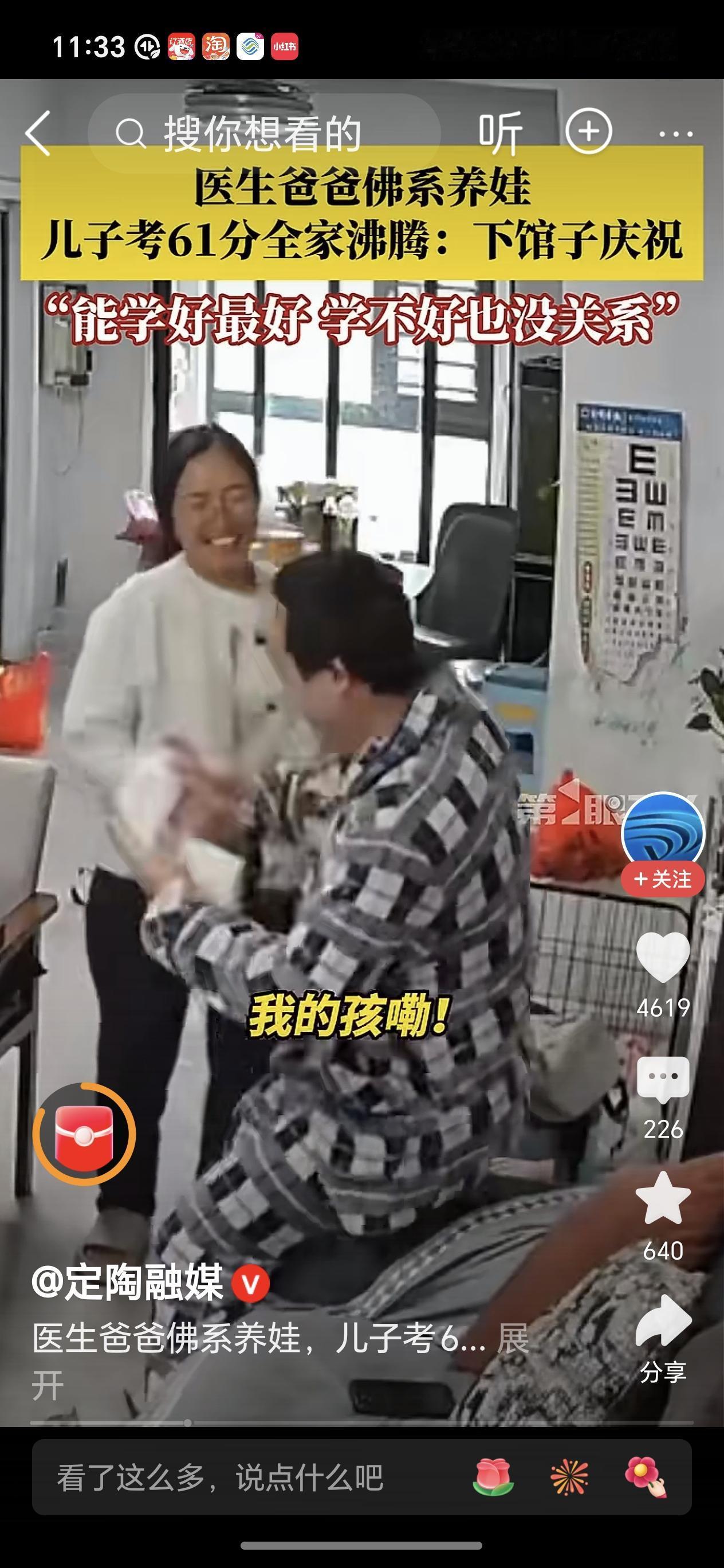 爸爸回应孩子考61分全家欢呼近日,安徽亳州儿子数学考61分终于及格了,母亲拿着卷子兴奋地告诉家人,全家为此事欢呼,医生爸爸更是兴奋地要孩子打电话向长辈们报喜,还带全家下馆子庆祝,医生爸爸回应称在医院看惯生死,孩子健康最重要,这家长太开明了,生在这个家庭的孩子们太有福了[赞]