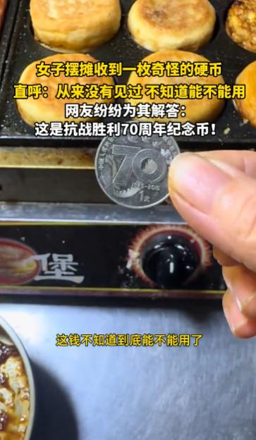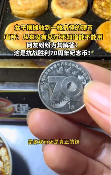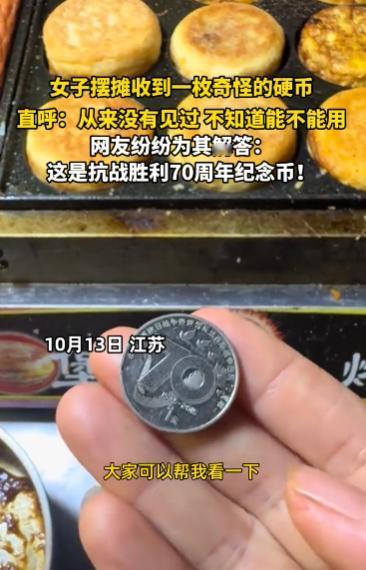 “开眼界了!”10月13日,江苏,一女子摆摊时收到了一枚奇怪的硬币,这枚硬币虽然摸起来和普通硬币的手感相同,但上面的花纹却不太一样,女子没见过,不知道这钱能不能用,网友:纪念币,可以流通! 纪念币、钞的种类多种多样,有些普通纪念币是可以直接花的,但是很多商家不太了解怕收到假的,一般会拒收,其实纪念币也可以拿到银行去兑换现金! 一女子摆摊卖小吃时,一个小朋友拿着枚特殊的硬币来买烤肠,它的手感和大小与普通的1元硬币无异,以至于女子点钱时才发现。 这枚硬币反面看就是正常的硬币,但它正面的花纹却十分特殊,普通1元硬币正面都是数字“1”,但这枚硬币正面却刻有“70”的字样,只有右下角刻着小小的1元,除此之外还有一些和平鸽围绕着数字。 女子没有见过这种钱,她不知道这硬币是游戏币还是真正的钱,不确定是否能流通,于是将硬币拍下来发到网上求助网友们。 一些网友在看到硬币正面时一下子认了出来,这是抗战胜利70周年纪念币,所以正面才会有“70”的字样,小朋友给的这个纪念币是可以在市面上流通的,直接花没问题,这可让不少人开了眼界! 信息来源:《女子摆摊收到一枚奇怪的硬币,直呼:从来没见过,不知道能不能用》观象视频