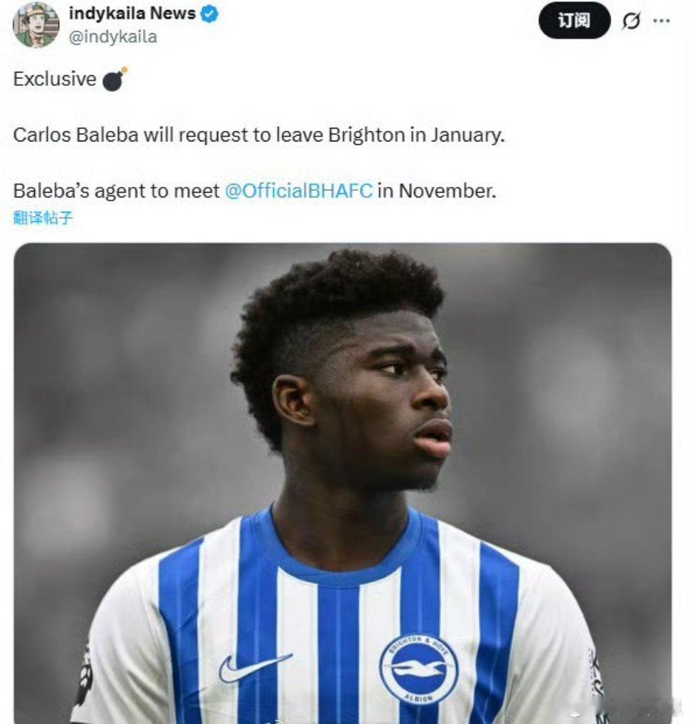 【巴勒巴要求冬窗离队】绿帽哥独家:布莱顿中场巴勒巴,将会要求在一月冬窗离队,他的经纪团队,预定将在11月与布莱顿管理层会面,到时正式提出转会申请。