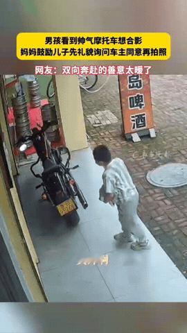 这对母子上央视新闻了! 山东莱西,一对骑着摩托车的母子,经过一家健身房店铺门口时,儿子看见门前有一辆耀眼的摩托车,顿时眼睛直冒光,真帅啊,小声和妈妈说,我想和摩托车合个影。 妈妈回答说,这是别人的东西,必须征得主人同意,你去店里问问,看行吗? 男孩胆小,不敢去问,妈妈鼓励他说:“不要紧,任何事都要自己去尝试”,男孩听了妈妈的话,勇敢地推门进去问:“叔叔,外面那辆摩托车我可以拍张照吗”?叔叔没多想就答应了,说:“可以呀,你想怎么拍就怎么拍,可以坐上去,摆个耶的姿势”。 大方有爱的老板,帮男孩完成了一桩力所能及的小事,妈妈用行动,教会了孩子,凡事要懂规矩,有边界感,要有沟通的勇气,这种言传身教的说服力,远比口头说教更能打动人,让孩子在耳濡目染的环境中,优秀的品德素质,深入骨髓。 这看似很普通的一件小事,孩子的懂事,老板的大爱,母亲的谆谆教导,孩子自然而然就学到正能量的东西,慢慢会有抵御风雨的力量,直至成为挺拔,正直,有温度的参天大树,成为一个有担当,有责任感的男子汉。 良好的家风胜过金山银山,大家说是不是? 母子温情瞬间