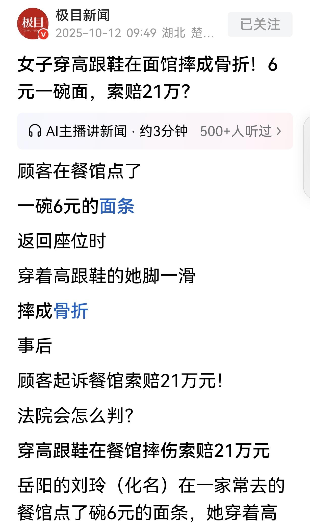 “这讹人的世道!”湖南岳阳,一女子穿着高跟鞋,一步三摇的去面馆吃6元的面,她一个不小心摔了个髌骨骨折,被鉴定为10级伤残。女子去找面馆索赔,面馆:你穿高跟鞋摔的,和我何干?女子一气之下把面馆告上法庭索赔21万,法院判决难以服众。 一碗 6 元的面条,赔出 3 万多!湖南岳阳这场官司刚判下来就吵翻了,穿高跟鞋摔骨折的女子索赔 21 万,面馆老板喊冤 “不是我的错”,法院的判决让不少人摸不着头脑。 出事的是岳阳华容县城里一家开了五年的老面馆,老板姓张,做的猪油拌面在附近小有名气。那天中午饭点,常客刘女士踩着近十厘米的细跟高跟鞋走进店里,点了碗拌面后转身往座位走。店里人多,她路过玻璃推拉门衔接处的台阶时,脚下一滑整个人往前扑,膝盖重重磕在地面,当场疼得站不起来。 张老板赶紧喊人帮忙,和其他顾客一起把刘女士送进医院。检查结果显示左髌骨骨折,必须手术治疗,前后花了近 4 万元医疗费。 刘女士休养期间,委托司法鉴定机构做了伤情鉴定,结论是十级伤残,建议伤休 180 天、护理 90 天、营养 60 天。按照湖南上一年度居民人均可支配收入计算,再加上医疗费、误工费、护理费等各项费用,她算出总损失超过 21 万,于是找到面馆要求全额赔偿。 张老板当场就拒绝了。他说店里每天客流量大,台阶处一直铺着防滑垫,墙上还贴了 “小心地滑” 的提示,当天地面也没泼洒汤汁油渍,其他客人都没出事,是刘女士自己穿高跟鞋没站稳。双方争执不下,刘女士一气之下把面馆告上了华容法院。 庭审时,双方都拿出了证据。刘女士提交了病历、鉴定报告和医疗费票据,强调面馆作为经营场所,理应保障顾客安全。 张老板则找来当天在场的两位食客作证,两人都证实事发时地面干燥,没发现异常湿滑,自己行走时也没感到不适。法院调取了面馆的监控,画面显示台阶处确实有防滑措施,但台阶高度差约 15 厘米,且未设置反光警示条。 最终法院判决,刘女士自行承担 85% 的责任,也就是 17.8 万多元;面馆因台阶未设反光警示条,存在轻微安全隐患,承担 15% 的责任,赔偿 3 万余元。判决生效后,张老板很快履行了赔偿,还在台阶处加装了黄色反光条和语音提示器。 有法律人士解释,十级伤残赔偿通常包含伤残赔偿金、医疗费、误工费等多个部分,刘女士索赔 21 万是基于各项损失的总和,但责任划分直接影响最终赔付金额。这场纠纷也让不少经营者开始检查自家场所的安全隐患,毕竟小心防范才能避免类似麻烦。 对此,你们有什么看法,欢迎评论留言~