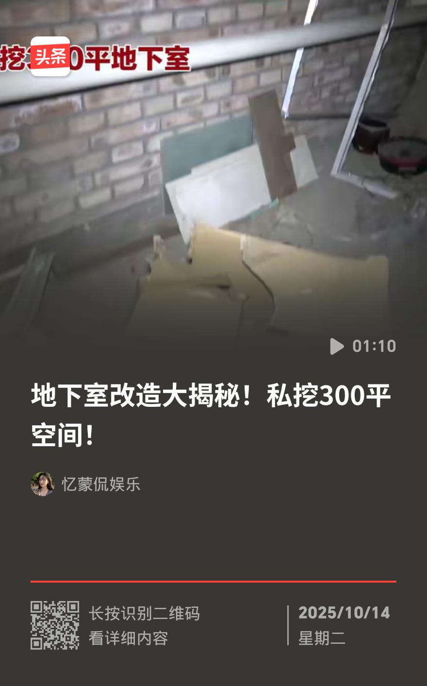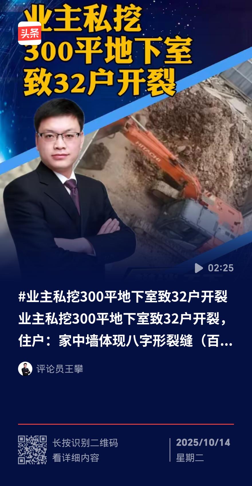 私挖300平地下室逼停整栋楼:土方暗运3个月,谁在装睡? 安徽六安景秀蓝湾小区这事儿,真是听得人后脖颈发凉!一楼业主愣是把地下挖成了300平的“秘密基地”,结果整栋9层楼32户全裂了缝,连顶楼窗台的大理石都崩断了,好好的家变成了Cu级危房——这可是专业鉴定里“局部承重失效”的信号,说通俗点,楼体随时可能出大问题 。 最让人纳闷的是,300平、深近4米的地下室,挖出来的土方少说也得上千立方米,堆起来跟座小山似的,这业主到底是怎么神不知鬼不觉运走的?看受害业主包女士说的细节才明白,这人简直把“隐蔽工程”玩到了极致:先用3米多高的围挡把施工区裹得严严实实,跟搭了个密不透风的“堡垒”似的,工人进去就锁门,外人根本瞅不见里面的动静。白天趁着大家上班,挖机在底下轰隆隆作业,到了下半夜三四点,小区里没人走动了,再用卡车悄悄把土方拉走,一路摸黑运到城郊的偏僻空地偷偷倾倒——正规消纳场要登记报备,他哪敢走正道啊 。 就这么“昼伏夜出”折腾了俩月,难道真没人发现?其实7月物业就察觉不对劲了,还下了整改通知,可光上报没下文,愣是眼睁睁看着挖机把楼基挖空。有业主8月就听见地下传来震动,找物业反映,得到的竟是“没执法权管不了”的托词 。这话说得也太敷衍了,没执法权就不能断电停水?不能拦着施工材料进场?上海之前有个类似案例,就是因为没物业监管才酿大祸,事后检察院直接给住建部门发了检察建议,不就是敲警钟说监管不能缺位吗? 要说这事儿里最冤的,还是那32户业主。包女士家在9楼,现在没一面墙是完整的,横向、纵向、八字形的裂缝跟蜘蛛网似的,下雨还往屋里渗水,好好的家成了“水帘洞”。政府担心楼塌,给每户发了10天安置费,一天150块,可这钱是涉事业主出的,10天之后去哪住、房子怎么修,全是未知数。更气人的是,找镇政府要说法,得到的回应竟是“不满意就走法律程序”,这态度能不让人寒心吗 ? 好在现在终于有了进展,住建局和城管局成立了工作组,地下室已经用混凝土回填了,涉事业主也被立案调查 。但这事儿远没结束,从法律层面说,他这行为可不是罚点钱就能了事的。上海之前有业主私挖地下室弄成危房,直接以危险作业罪判了刑,缓刑一年还禁止从事装修行业。六安这事儿更严重,32户的安全都受威胁,律师说了,很可能触犯危害公共安全罪,最高能判十年。 其实咱普通业主遇到这种事,真不用吃哑巴亏。先拿手机拍好裂缝、录下施工噪音当证据,找物业要处理记录,要是物业不管,直接打12319找城管,或者报警说“危害公共安全”,这些部门必须出面制止。最好联合其他业主一起维权,人多力量大,不管是索赔房屋贬值损失,还是追讨安置费,都更有底气。 现在地下室是填了,但楼体的裂缝、业主心里的疙瘩可没那么容易补。这事儿给所有小区都提了醒:私挖地下室就是在拿整栋楼的人命赌,而监管缺位就是给这种疯狂行为开了绿灯。希望后续追责能实打实,不光要让涉事业主付出代价,也得让失职的监管方好好反思——毕竟保住大家的安全,才是最该“高效办成的一件事”。小区地下室设计 挖地下室施工队 排屋别墅地下室