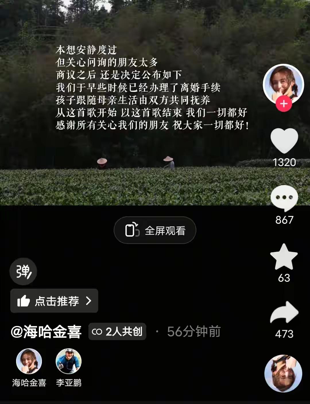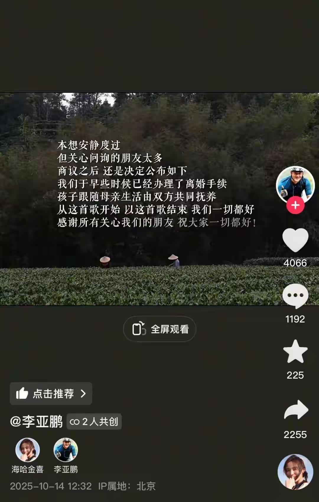 李亚鹏官宣离婚!3岁女儿随母,女方曾坦言还债优先 10月14日,李亚鹏与海哈金喜同步官宣离婚,这段维系三年的婚姻终落幕。官宣明确3岁女儿将跟随母亲海哈金喜生活,由双方共同抚养 。 这则消息不算突然。今年5月,海哈金喜就曾透露,为降低生活成本搬去小房子,两人名下无房产,直言“努力工作,还债优先”。当时她否认离婚,称只是因李亚鹏“上山下乡找茶叶”、自己忙工作室而久未同框 。 从2020年官宣恋情,到2022年结婚生女,这对相差19岁的夫妻曾共渡债务难关。如今平静告别,网友唏嘘:终究没扛过柴米油盐的磋磨,更心疼独自带娃还需直面经济压力的海哈金喜。信息来源《九派新闻综合津云新闻,中国执行信息公开网此前报道。作品声明:内容取材于网络,个人观点仅供参考。