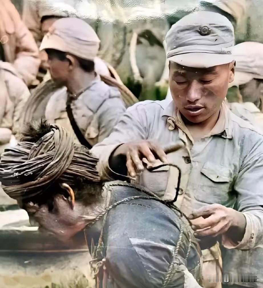 日本鬼子捆人是有一套的,这张照片就清晰展示了它们捆人的技术,绳子非常细,看样子像是麻绳,绳子越细,捆人的时候就捆的越结实,据说绳子可以勒到人的关节缝里,一旦被捆上之后,根本就动弹不得,画面中的这个老人,就是被日本鬼子用这根细绳给捆住了,这种捆法非常的缺德,因为绳子勒住了脖子,让人无法呼吸,如果不是国军士兵救的及时,这个老人恐怕也挺不了太多的时间!