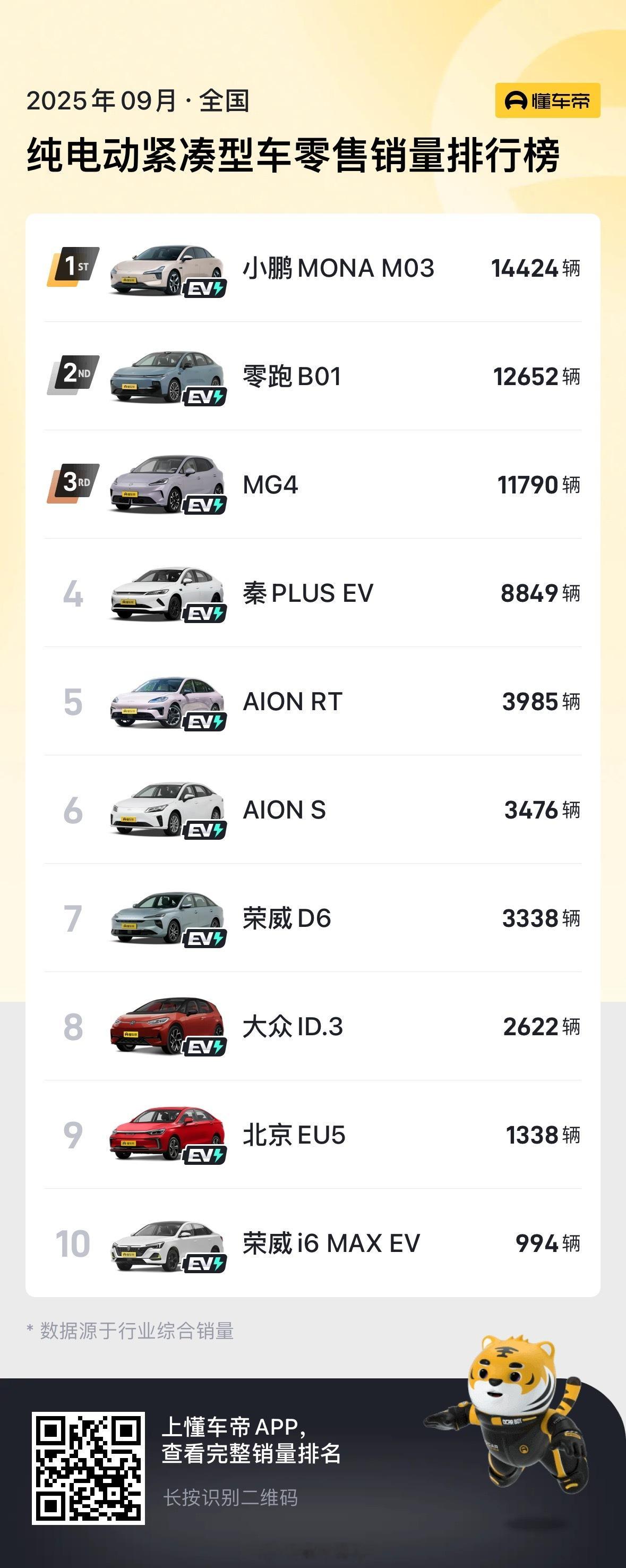 MG4在9月居然三榜齐上,总榜第10、纯电榜第3、新能源榜第5,销量都是11790辆!一辆车同时出现在三个热门赛道,MG4能成黑马,不只是因为性价比。在纯电市场,它直面小鹏、零跑这些新势力还能稳居前三,说明产品力真的被认可了——续航实在,设计戳中年轻人审美