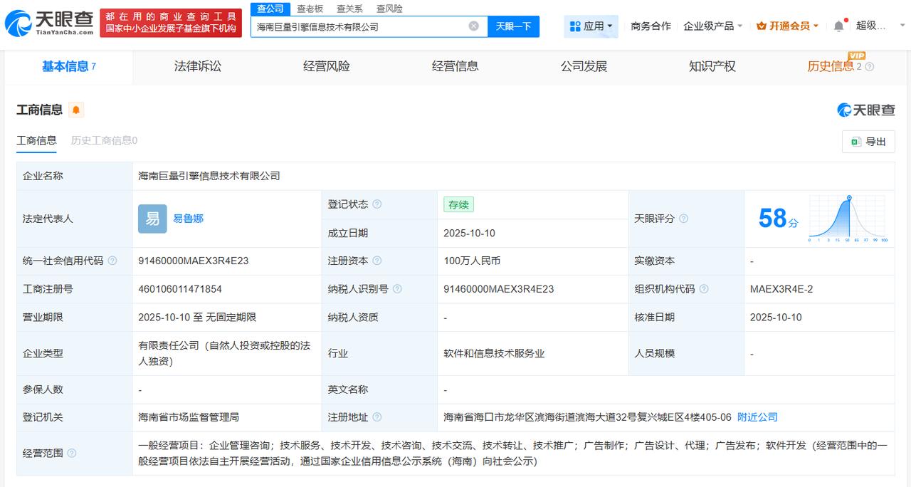 天眼查App显示,近日,海南巨量引擎信息技术有限公司成立,法定代表人为易鲁娜,注册资本100万人民币,经营范围包括企业管理咨询、广告制作、软件开发等。股权全景穿透图显示,该公司由海南巨量引擎科技有限公司全资持股,后者为抖音集团(香港)有限公司全资子公司。 天眼查信息: