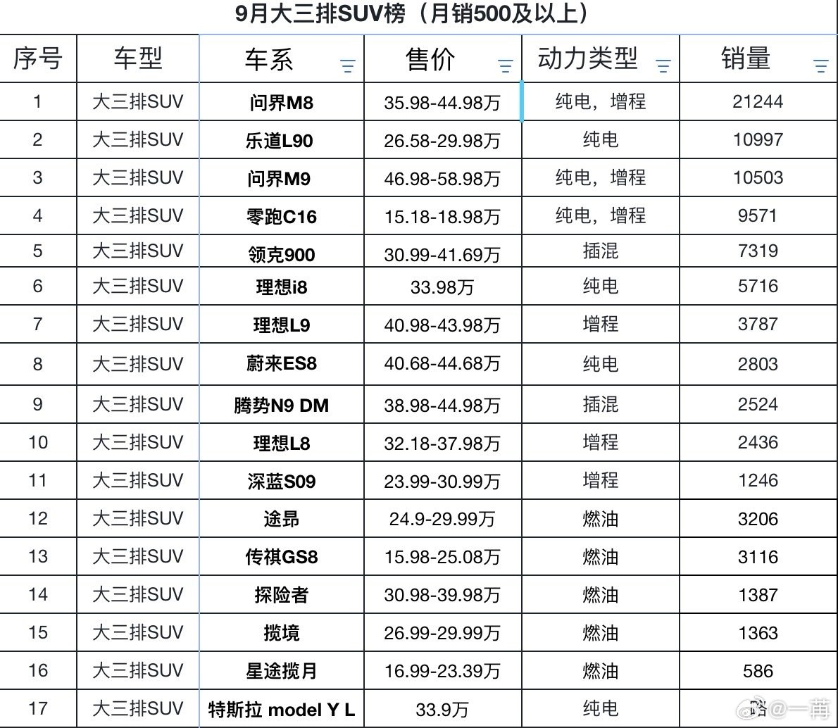 9月销量出了,今天邀请 直播聊聊三排座大车。他们都是我的老朋友,有的是汽车行业老炮,有的是乐道理想双料车主,总之都是大三排座SUV或MPV的长期使用者。今晚8:00我们一起友好探讨一下这个细分领域。SUVMPV ​​​