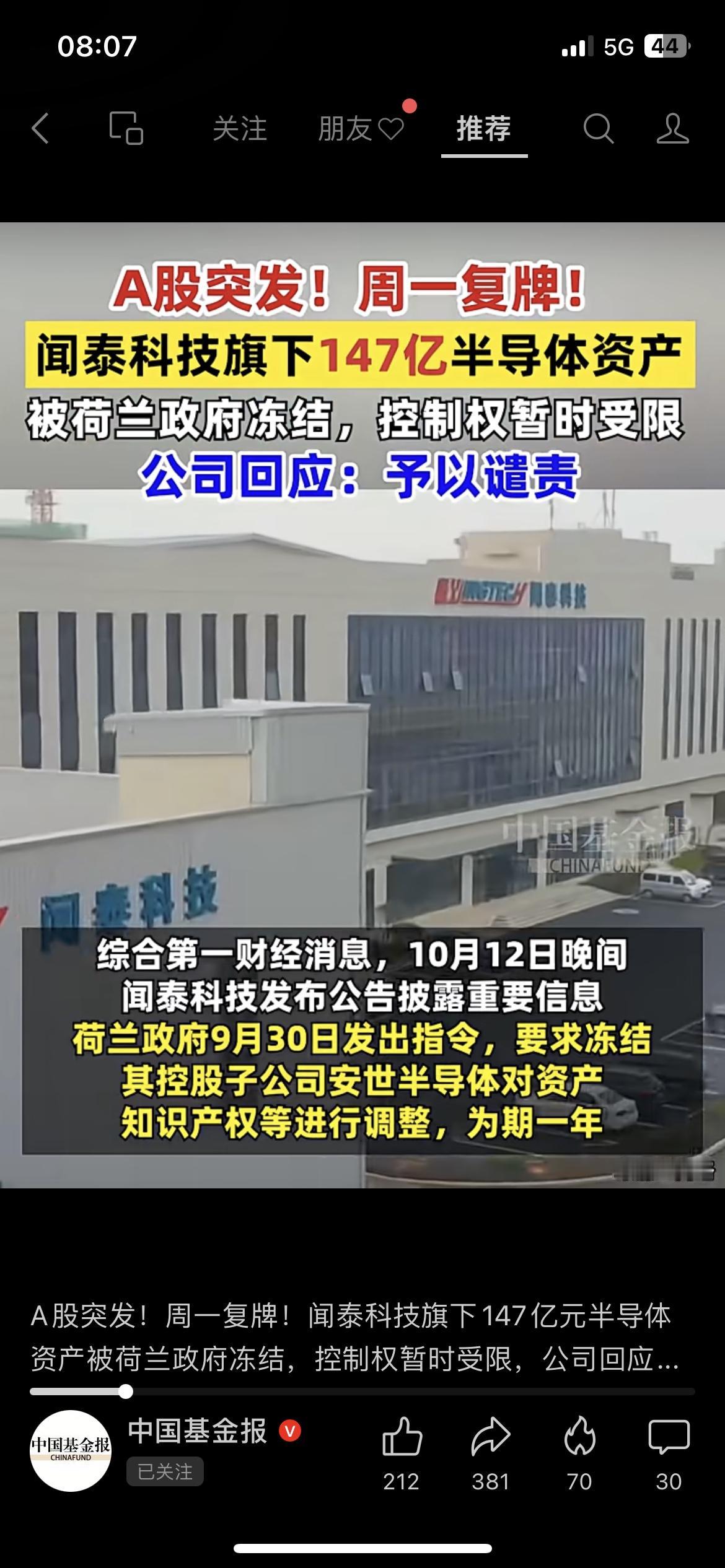 A股大瓜!闻泰科技147亿半导体资产被荷兰冻结,周一复牌你敢抄底吗? 家人们,