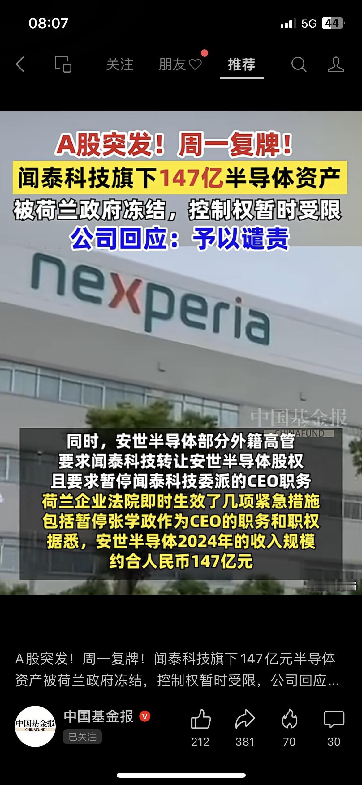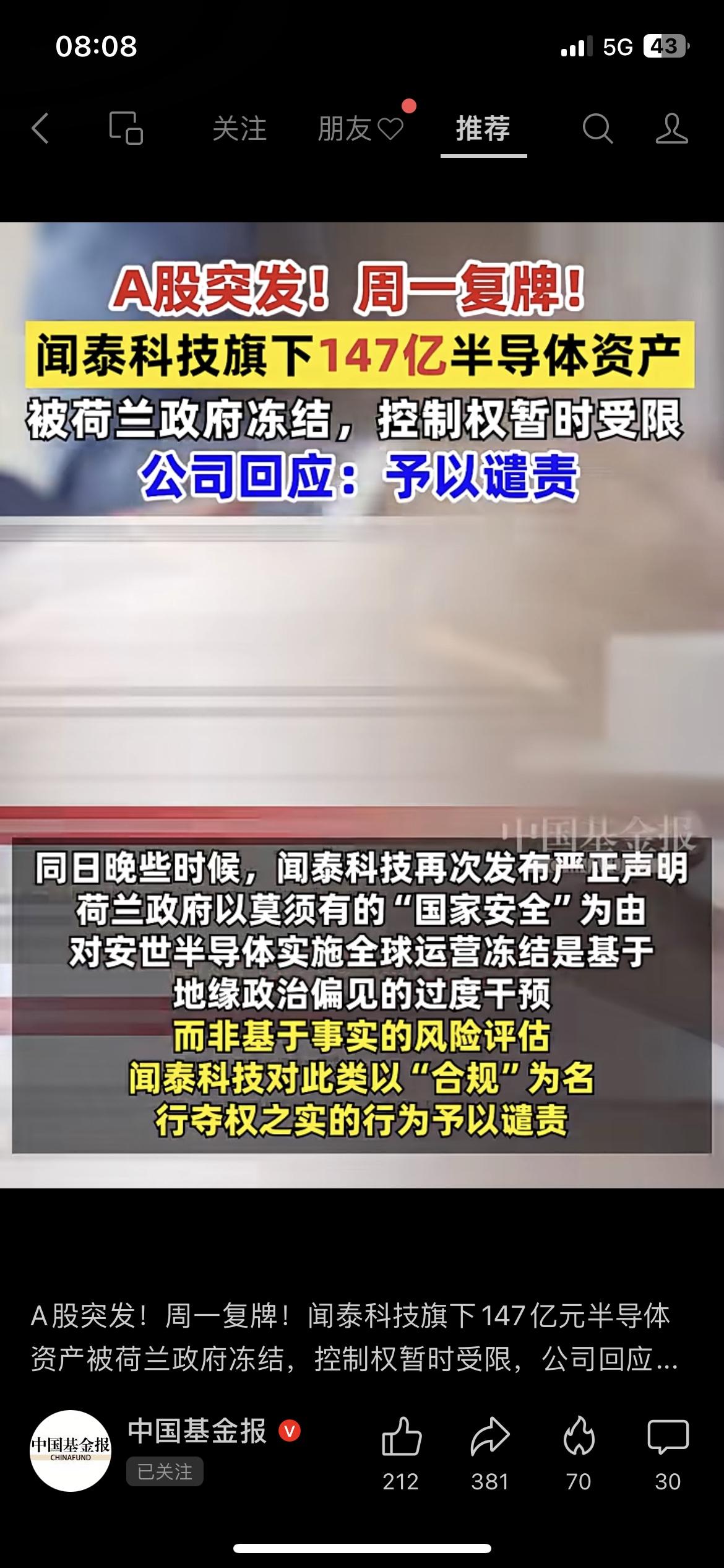 A股大瓜!闻泰科技147亿半导体资产被荷兰冻结,周一复牌你敢抄底吗? 家人们,A股又出大新闻了!闻泰科技旗下147亿的半导体资产被荷兰政府冻结,控制权直接受限,周一就要复牌了!这波操作你看懂了吗? 咱就说,闻泰科技这两年在半导体领域砸了这么多钱,结果被荷兰来这么一下,这不是明摆着卡脖子吗?公司还说要谴责,谴责有啥用啊,真金白银都被冻住了。这事儿对A股半导体板块的影响得多大啊,周一开盘估计又是一片绿。 我觉得啊,这事儿背后肯定不简单,说不定是漂亮国又在搞鬼。咱们大A的半导体企业真是太难了,好不容易有点起色,就被各种限制。你们说,周一闻泰科技复牌,是该跑还是该抄底?评论区聊聊,也让我看看大家对这波操作的看法!