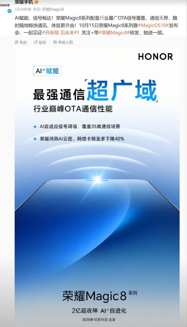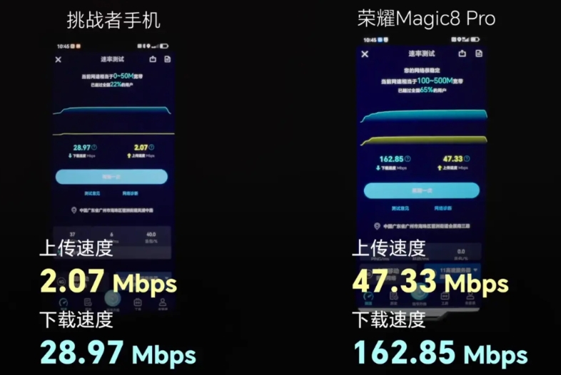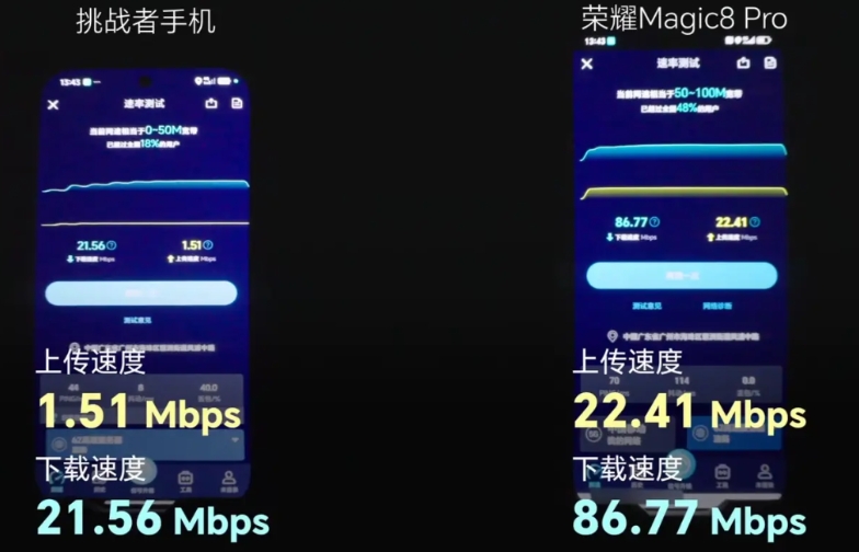 小米17 Pro Max、iPhone 17 Pro Max、荣耀Magic8 Pro弱网环境下网速对比: 小米:上传1.51Mbps,下载21.56Mbps 苹果:上传2.07Mbps,下载28.97Mbps 荣耀对比小米:22.41Mbps,86.77Mbps 荣耀对比苹果:47.33Mbps,162.85Mbps 这是荣耀举行的千机信号比拼比赛,用户自己的手机对比荣耀Magic8 Pro,参赛的时候发现有小米和苹果的身影,大家都是刚刚发布的新旗舰,但结果显而易见荣耀遥遥领先了。