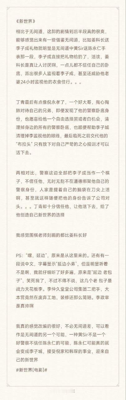 《新世界》相比于无间道,这部的剧情到后半段真的很爽,能够感觉出来有一...