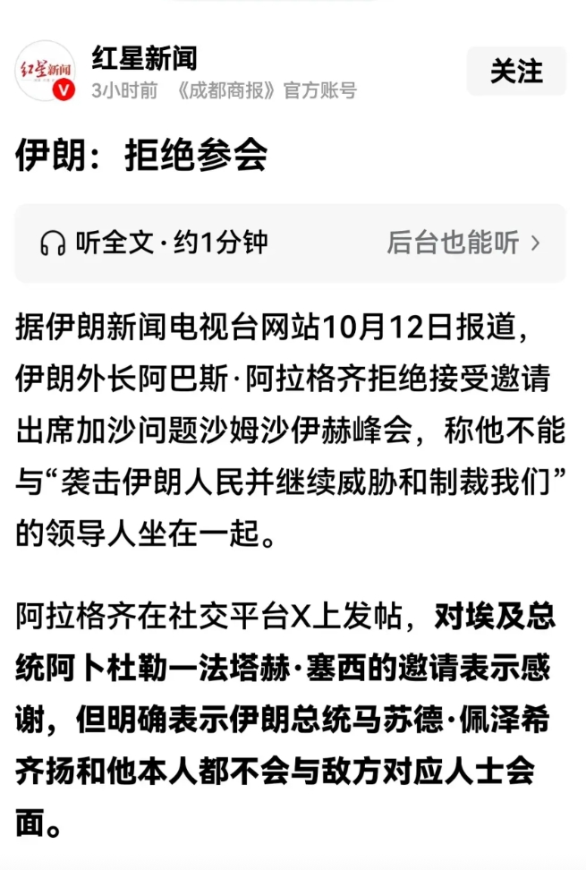 伊朗人很明白,他们可以和美国总统在一起开会,因为他至少一半是人一半是鬼。但绝不能与以色列人同台。因为“人鬼情未了”,反以是他们的名片,更是他们在中东得以生存发展的一面旗帜。 埃及总统塞西能够发出邀请,已经算是伊朗取得胜利了,完全没有必要为了参加一个师出无名的峰会,而毁掉建国就树立起来的名节。 伊朗不是又当又立的国家,更预感到加沙问题远没有结束。以色列不可能放过伊朗,更不可能放过参加峰会的所有国家。