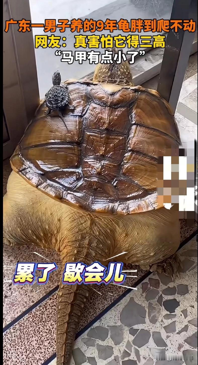 家人们快来看广东这只“肥宅龟”!养了9年胖到爬不动,网友都担心它得“三高”,还调侃它“马甲都嫌小了”! 咱就说,这龟主得多会喂啊,把龟养成了移动的“龟形小山”,怕是连龟壳都快装不下这身肉了。养宠物养到这份上,也是没谁了~ 你们家养的宠物有啥离谱的“发福”经历不?比如猫胖成球、狗走两步就喘的?快在评论区晒晒,让我看看谁的宠物是“干饭王者”!