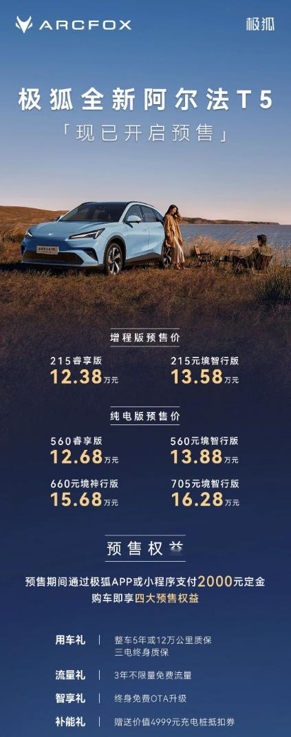 极狐全新阿尔法T5 极狐全新阿尔法T5开启预售,预售价12.38万到16.28万,购车可享4大权益,10月底正式上市。这次加入了增程版,外观和纯电版不一样,封闭式前脸,两侧包围有区别,1.5L北汽自研神擎增程动力,宁德时代骁遥电池,纯电续航215km,综合续航1215km,馈电油耗5.18L,据说在静谧性上下功夫了,感兴趣的小伙伴后续可以店里试试。