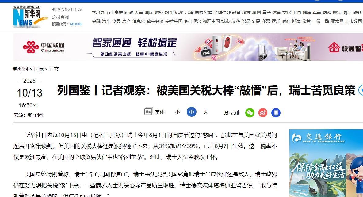 [浮云]在我们反制美国之后,瑞士《新苏黎世报》表示,中国的反制让美国陷入了无牌可打的窘境!10月13日,瑞士《新苏黎世报》刊文表示,中国再次在对手疲惫时使出了杀手锏,而特朗普的回击显然也在中国的预料之中。对于美国而言,中国几天前宣布收紧稀土出口管制的举措无疑是出乎意料的。 2月份,美国总统特朗普签署行政命令,对中国商品加征10%关税,试图通过层层叠加的壁垒重塑贸易格局。 中国没有贸然硬碰,而是选择在关键节点蓄势待发,4月,美国进一步将关税推高到34%,并取消小额包裹免税,这直接触及了中国出口企业的痛点。 面对这种单边主义升级,中国商务部迅速回应,对美国进口的鸡肉、小麦、玉米等农产品加征15%关税,同时对部分美国企业列入不可靠实体清单。 这不是简单的对等报复,而是基于多边规则的克制反击。 10月9日,中国商务部、海关总署联合发布公告,对中重稀土相关物项实施出口管制,包括新增五种稀土元素如钬、铽、铕等,以及相关设备和技术。 这一系列措施,不是仓促之举,而是对美国持续施压的战略回应。 中国这次管制措施的力度前所未有,它不只限于原材料出口,还延伸到加工技术和设备,甚至禁止中国公民向境外提供稀土分离技术支持。 这直接堵死了美国绕道第三方国家的路径,美国此前试图通过澳大利亚的Lynas公司进口稀土矿石,但加工环节仍需运回中国完成。 新规一出,这些矿石的提纯将面临瓶颈,导致供应链中断。 全球半导体行业首当其冲:英特尔和高通的芯片生产中,稀土用于制造高性能磁体,如果供应延迟一个月,就能引发数亿美元的损失。 美国国防部报告显示,到2027年,其稀土库存仅够维持半年作战需求,新规要求对涉及军用的出口申请逐案审查,这相当于给美国军工企业套上了紧箍咒。 欧洲也在警铃大作:法国索尔维公司正扩建加工厂,但预计到2026年,其产能仅能覆盖欧盟需求的20%,远不足以填补中国份额的空白。 10月10日,特朗普在社交媒体上发文,威胁从11月1日起对中国商品加征额外100%关税,并加强软件出口管制。 这听起来气势汹汹,但细看之下,不过是旧招的重演。 早在4月,美国就将关税推到125%的峰值,却换来中国对美农产品和能源的精准反击,导致美国农民损失数十亿美元,玉米出口量同比下滑30%。 华尔街随之动荡:大科技股市值蒸发2万亿美元,苹果和特斯拉股价跌幅超过8%。 因为这些企业深陷中国供应链,稀土短缺会推高生产成本,终端产品价格上涨将削弱竞争力,特朗普的团队显然低估了这一连锁效应,他们寄希望于本土化,但现实远非想象中顺利。 依我看,美国的困境源于一种战略傲慢,他们总以为关税是万能钥匙,却忽略了资源禀赋的现实。 特朗普的威胁,不过是虚张声势的回光返照,它无法掩盖本土产业的脆弱。 相反,中国这一步棋,体现了克制与精准的智慧:不是全面封锁,而是有针对性的管制,既维护了国家利益,又留下了谈判空间。 美国若继续一意孤行,只会加速自身孤立;反之,如果转向合作,或许还能分一杯羹,但现实是,华盛顿的决策层似乎还沉浸在冷战思维中,难以醒悟。 信息来源:新华网 列国鉴丨记者观察:被美国关税大棒“敲懵”后,瑞士苦觅良策