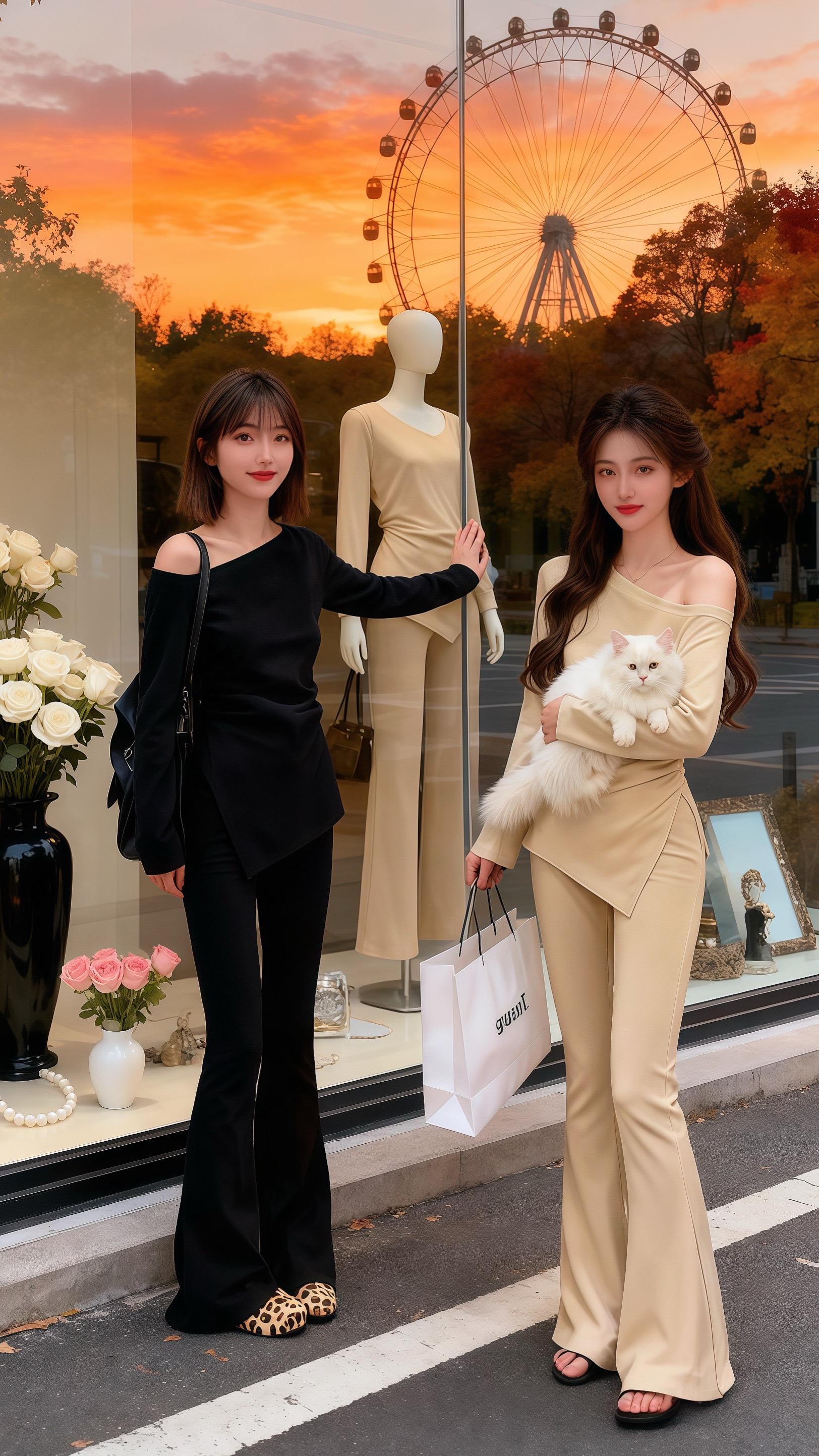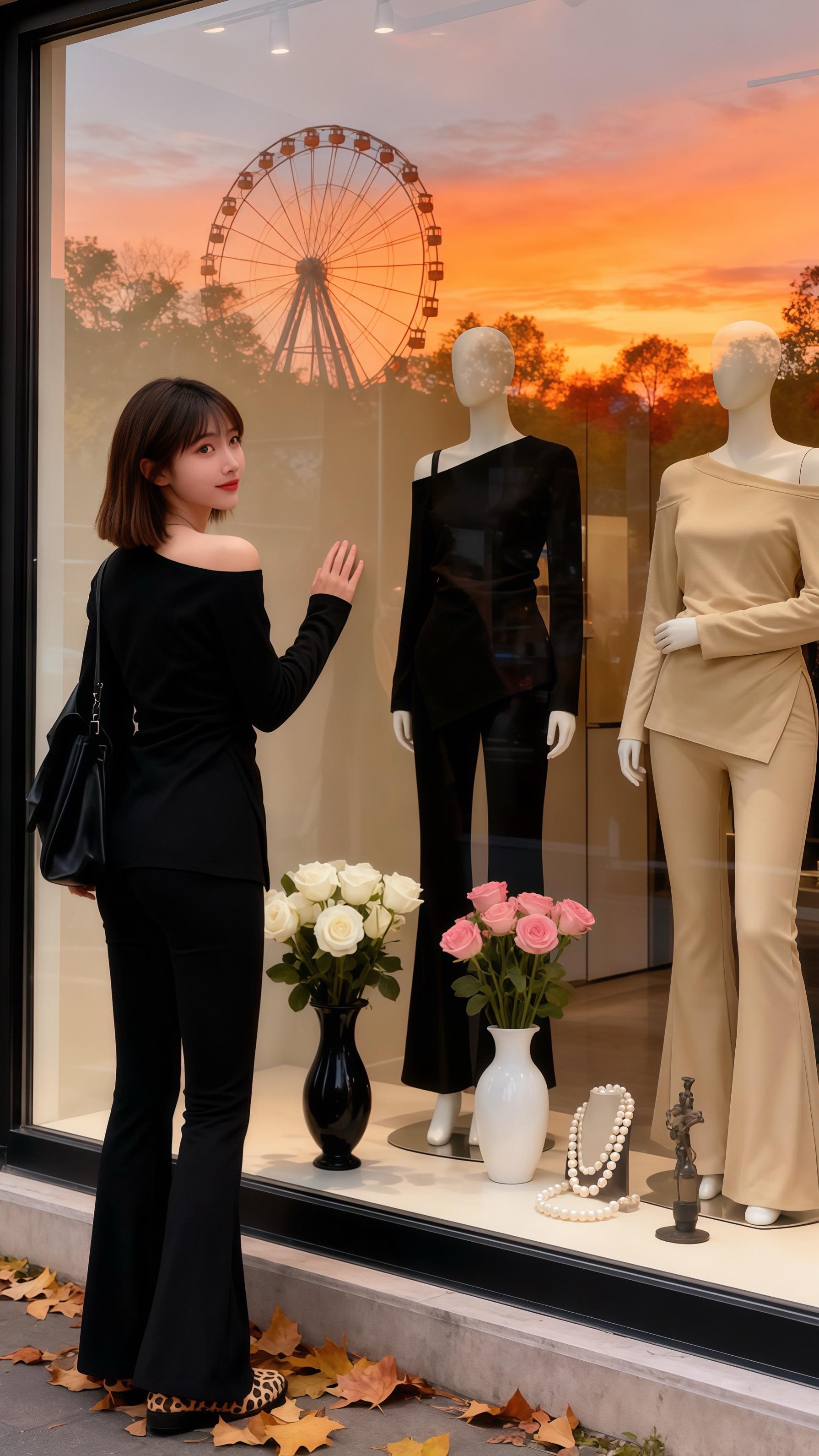 《秋日橱窗下的时尚二重奏》深秋的黄昏把天空晕染成橘粉色,摩天轮在远处缓缓转动。林薇站在橱窗前,指尖几乎要触到那套黑色不对称露肩套装——和她身上的一模一样。