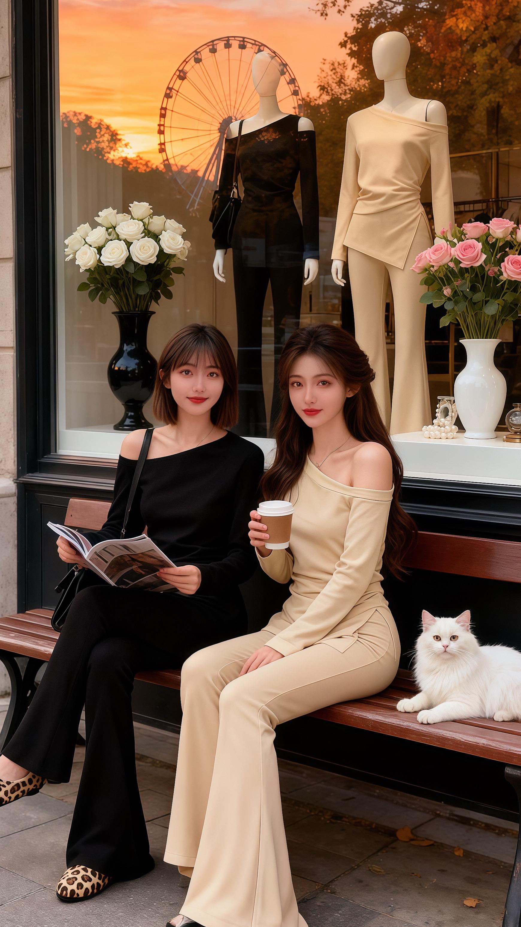 后来她们坐在长椅上,林薇翻着时尚杂志,苏晴逗着蹭过来的白猫。路过的行人总忍不住多看两眼:同款不同色的露肩套装,一个配豹纹鞋飒气,一个搭黑凉鞋温柔,在落叶与花束的映衬下,成了这条街最亮眼的风景。