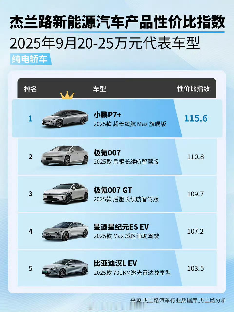 在杰兰路最新发布的新能源汽车性价比指数中,