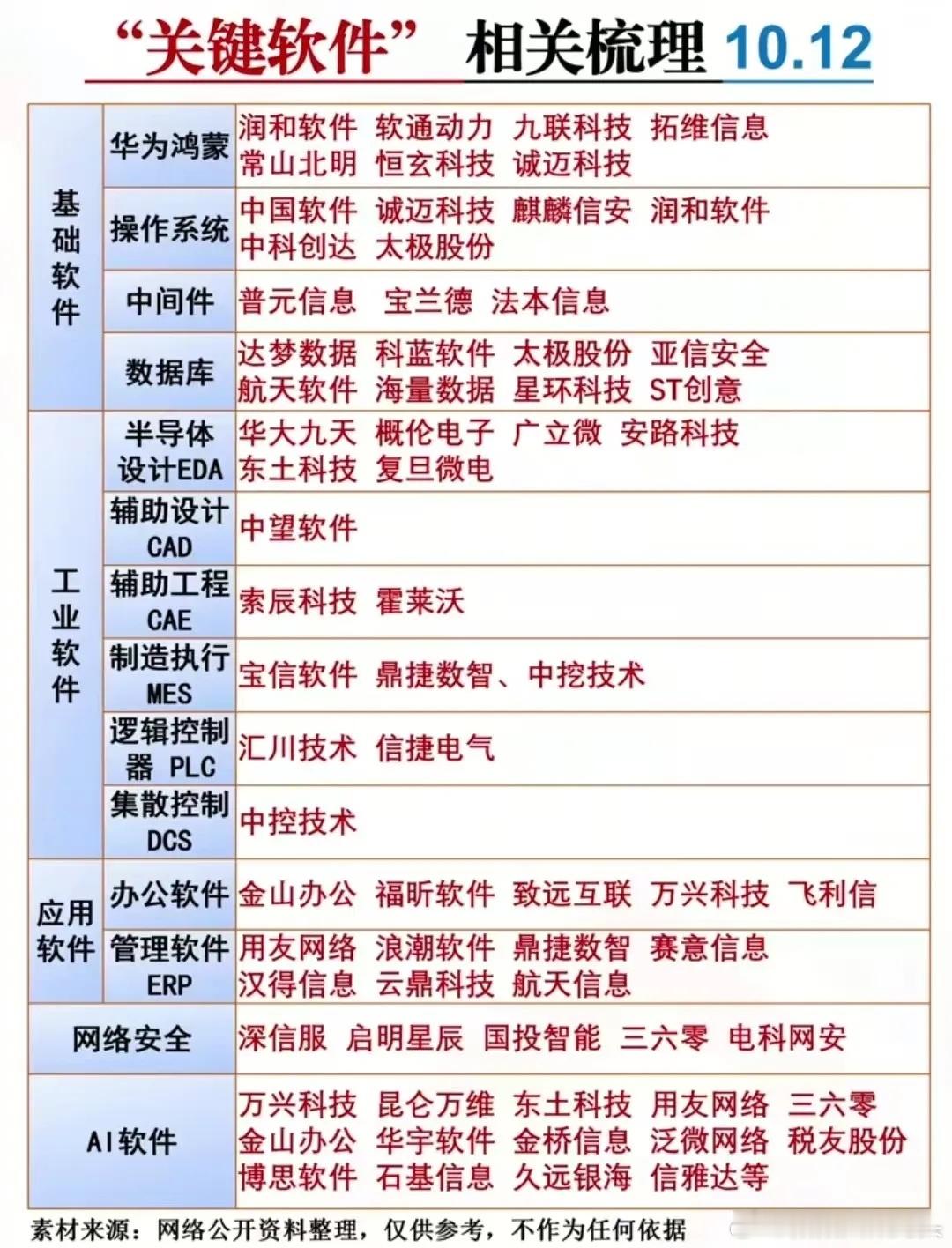 (2)国产软件概念:10月10日特朗普宣布对所有关键软件实施出口管制。这使得软件国产化替代的紧迫性进一步凸显,有望加速国产操作系统、工业软件等领域的国产化进程。国产软件核心龙头代表有中国软件、软通动力、金山办公、华大九天等等。