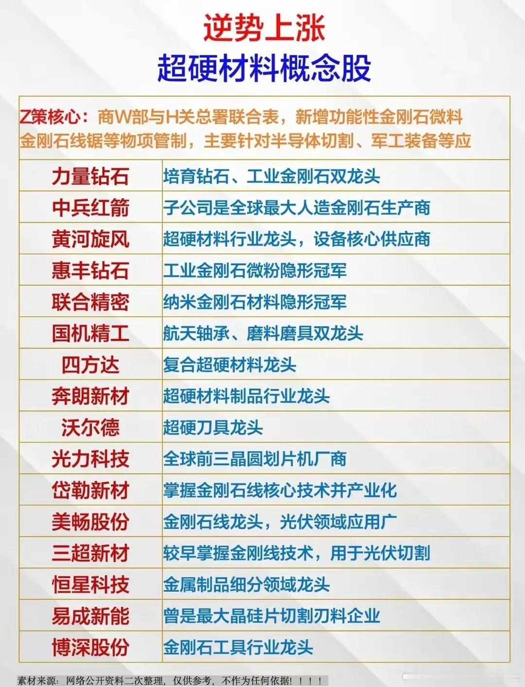 (1)商W部与海关总署联合发布公告,宣布对多项超硬材料及相关技术实施出口管制,该措施将于11月8日正式生效。超硬材料概念核心龙头代表:力量钻石、中兵红箭