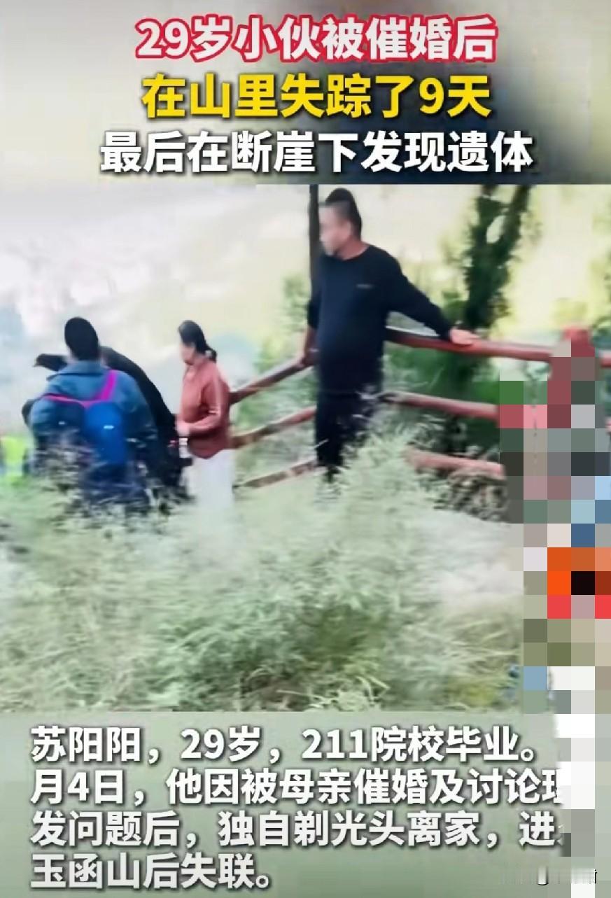 济南29岁苏阳阳找到了,可是却已经是一具冰冷的身体,是什么让现在的年轻人一次一次在活着与死去里挣扎? 前有跳河新郎,后有同龄青年催婚而不堪压力,选择极端方式,这个社会需要更多的心理疏导者,缓解年轻人的生活压力,不要让悲剧再次发生了。 事发的时候苏阳阳和母亲因为催婚,剃头离家,1.85的大好青年啊,211毕业生,做长辈的何愁怕自家儿子找不到对象啊,缘分来了自然水到渠成。 现在的年轻人愿意把事业放在前面,就让他们去吧,稳定了工作,稳定了收入,还怕没有女孩子不喜欢吗? 为人父母的,小时候让孩子“好好学习,天天向上”,长大了,又在输入“早日成家,早生贵子”。就没有一丝他们自己的想法吗? 多给年轻人一点空间吧,婚姻是他们自己的事,不再是长辈捆绑和约束的东西了,不要再把生活的压力给到下一代了,随遇而安吧。 (图片来自网络视频)