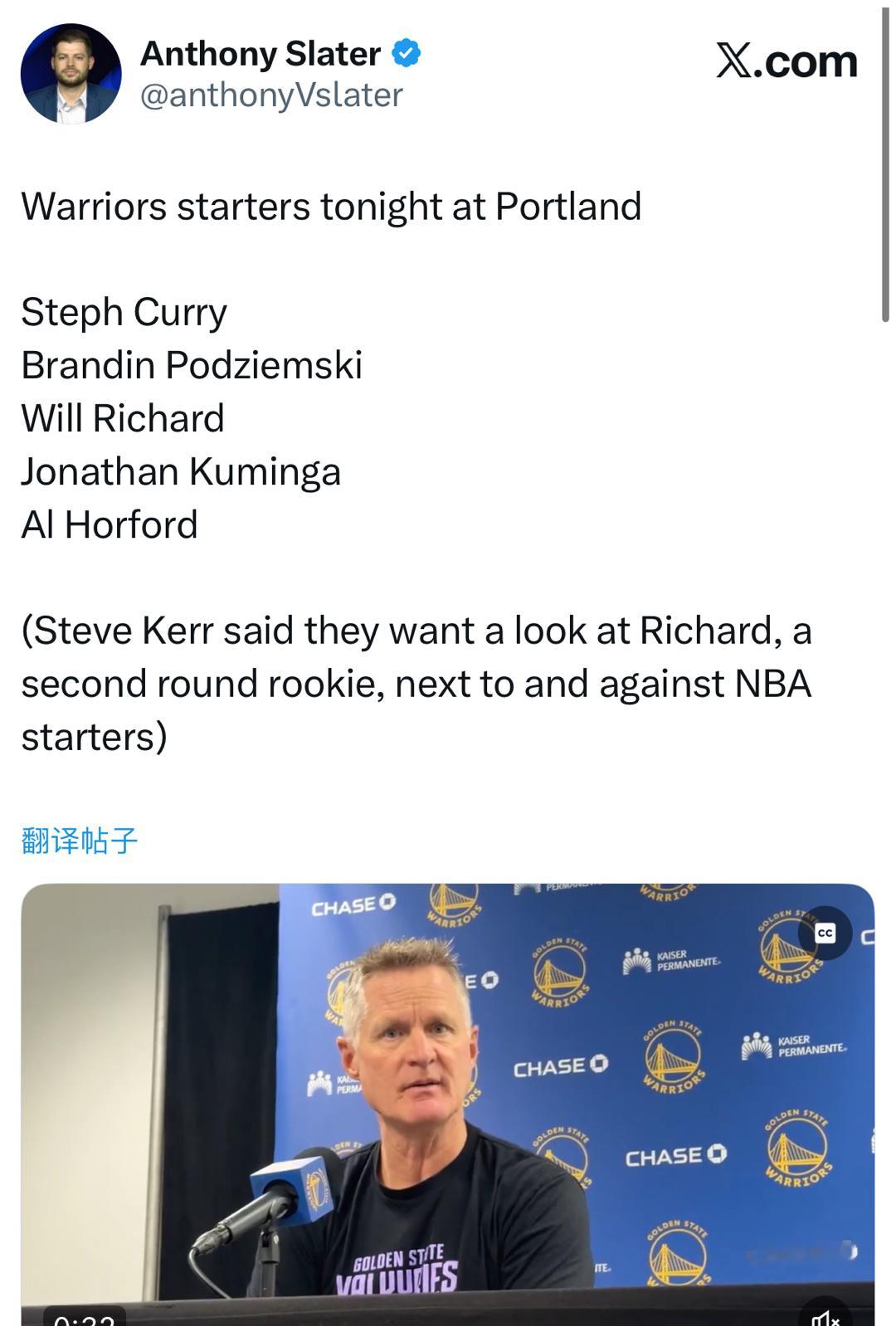 今天首发阵容库里波杰理查德库名家霍福德勇士vs开拓者