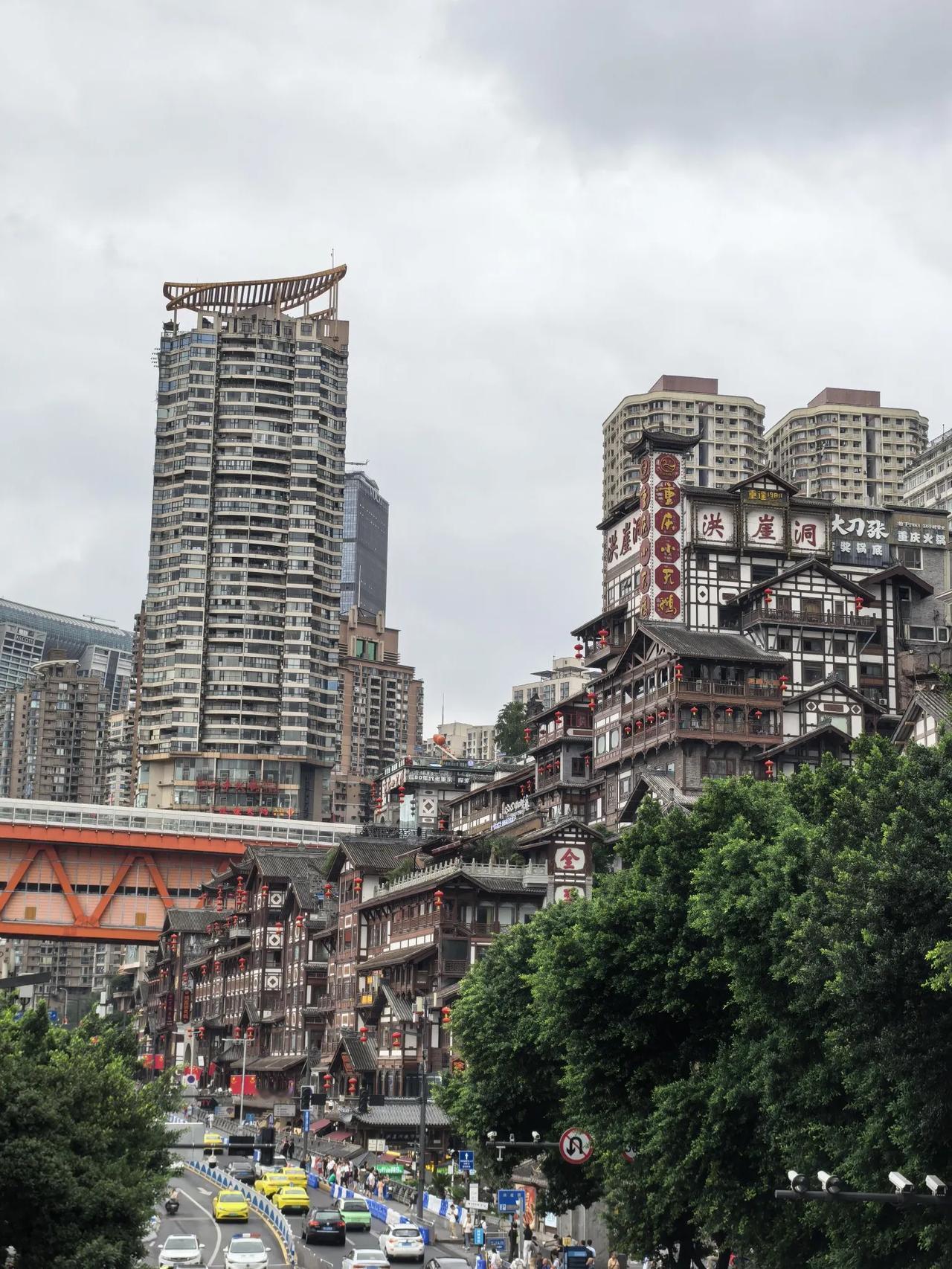 重庆地形太复杂了,从解放碑走开,很快看到了筷子楼,走上一个天桥到对面居然就看到了洪崖洞的11楼。在重庆医科大学附属第二医院广场我们看到了很惊悚的一幕,原来这边的一楼是隔壁楼的22层,站在连接两楼的天桥上往下看,如临悬崖,心惊肉跳,赶紧逃跑。终于找到隔壁高楼的电梯,从22层下到悬崖底,就是一楼,出门右拐过了人行道,远远便看到洪崖洞全景,再往前走几步,就到了洪崖洞下,真的很玄幻。