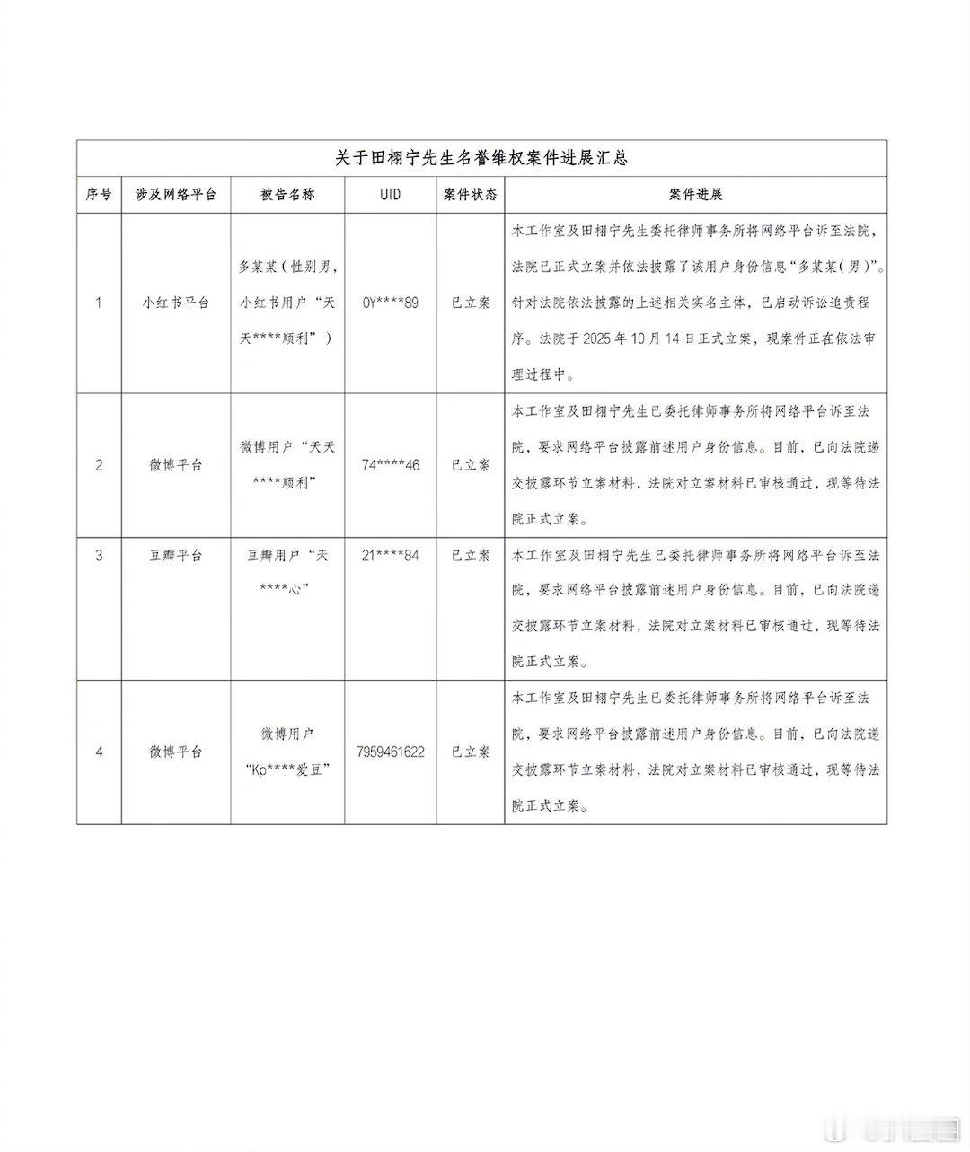 田栩宁工作室更新维权进度 对于牵手视频田栩宁方未回应,而是发了维权进度~[吃瓜]
