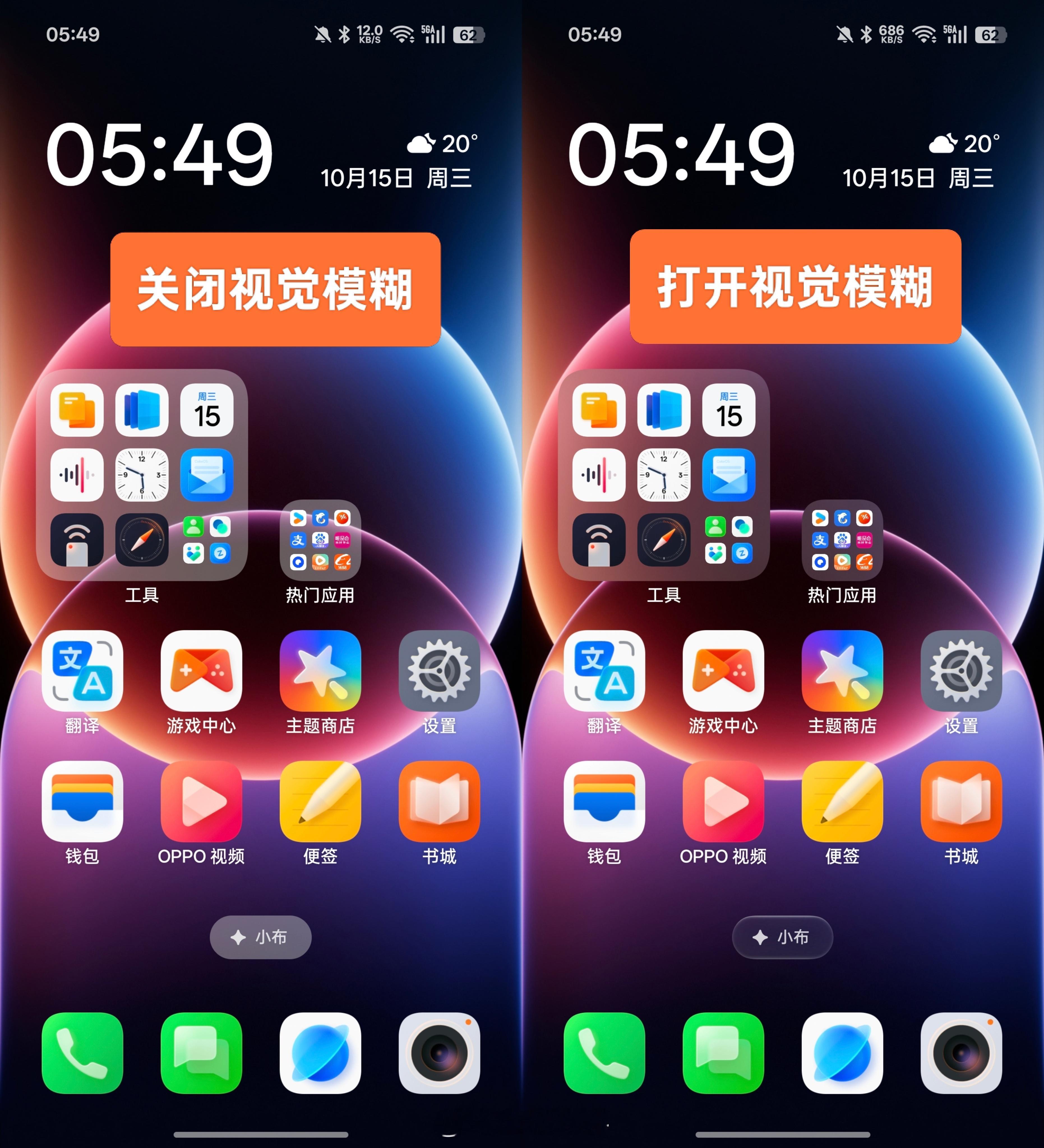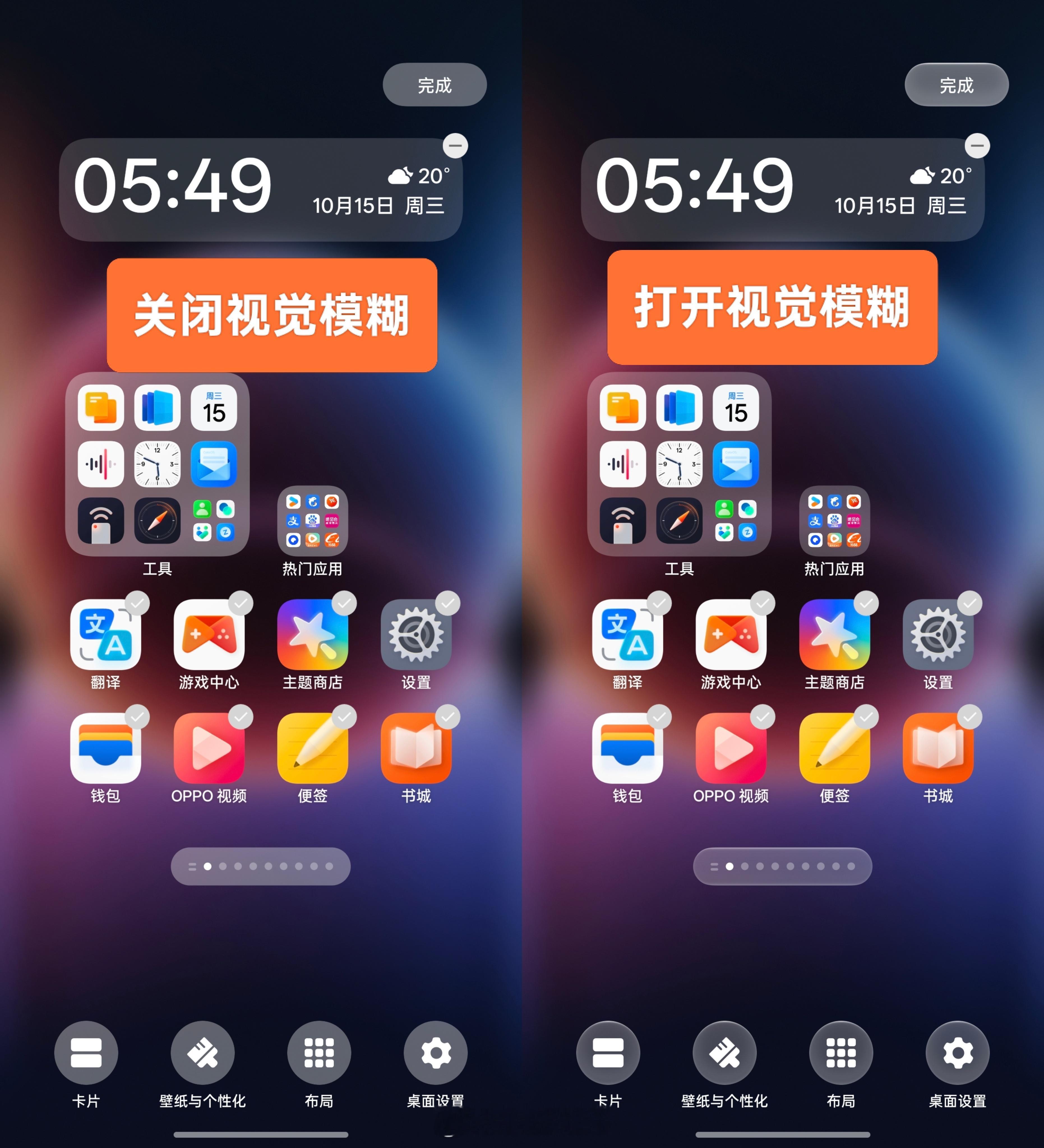 这次ColorOS16把“高阶材质”升级成了“视觉模糊”,除了文件夹的高斯模糊