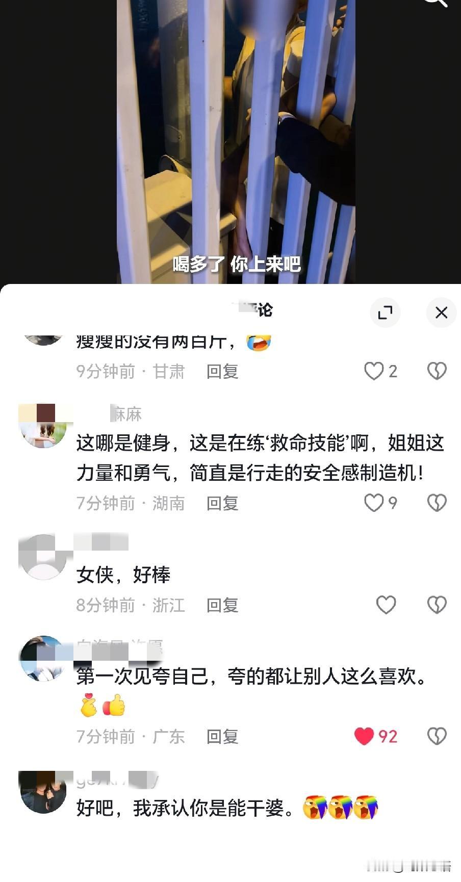 女侠胡慧珠,火上人民日报,让全国人民都认识你了! 近日,辽宁大连一名男子因醉酒情绪失控,在某处栏杆旁摇摇欲坠,意图轻生。千钧一发之际,恰巧路过的胡慧珠没有丝毫犹豫,一个箭步冲上前,死死攥住了男子的手。 事后谈及当时的心理活动,胡慧珠眼中闪烁着坚定:“那一刻,我心里迅速盘算着,我平时有健身习惯,硬拉一百斤都不在话下,对自己的力量有底气。再瞧瞧这位大哥,身形瘦弱,目测体重远不到两百斤。我心里就一个念头——只要我抓住他,只要我不松手,他绝对掉不下去,我绝不允许这样的事发生!” 凭借着这份果敢与自信,胡慧珠迅速调整姿势,双手如铁钳般紧紧握住男子手腕,同时巧妙地将他手臂别住、固定在栏杆上,形成了一个稳固的“锁扣”。 这个动作看似简单,却需要极大的力量与精准的判断,稍有差池,后果不堪设想。但胡慧珠没有丝毫慌乱,她的眼神中透露出一种不容置疑的坚定,仿佛在告诉男子:“有我在,你不会有事。” 在胡慧珠的坚持下,男子逐渐放弃了挣扎,情绪也慢慢稳定下来。最终,在众人的协助下,男子被安全救下。 事后,胡慧珠回忆起自己的举动,嘴角扬起一抹自豪的微笑:“那一刻,我就是有勇有谋的女侠,或者说是女英雄吧!我为自己当时的担当感到骄傲,觉得自己真的很棒。” 此事引发网友热议,有网友说:这哪是健身,这是在练‘救命技能’啊,姐姐这力量和勇气,简直是行走的安全感制造机! 网友说:第一次见夸自己,夸的都让别人这么喜欢。 还有网友说:救人一命胜造七级浮屠,你当真是女侠没错了! 都是满屏的夸奖!胡慧珠的英勇之举,不仅挽救了一条生命,更传递出了满满的正能量。她用自己的行动证明,在危难时刻,每个人都可以成为英雄,只要心中有爱,有勇气,就能在关键时刻挺身而出,守护他人的安全。 此时的你,是不是也被这热情,勇敢,善良的姑娘感染到了满满的正能量了呢?