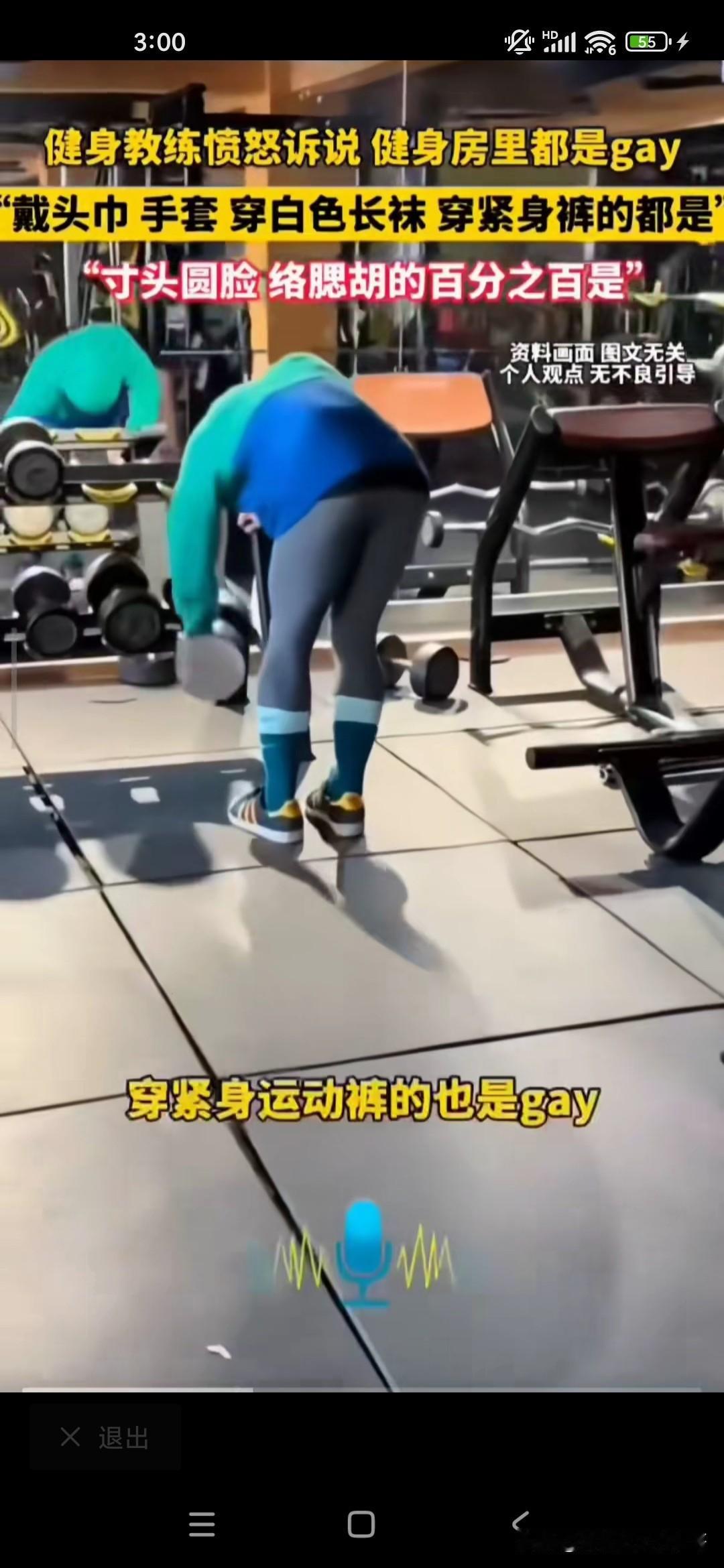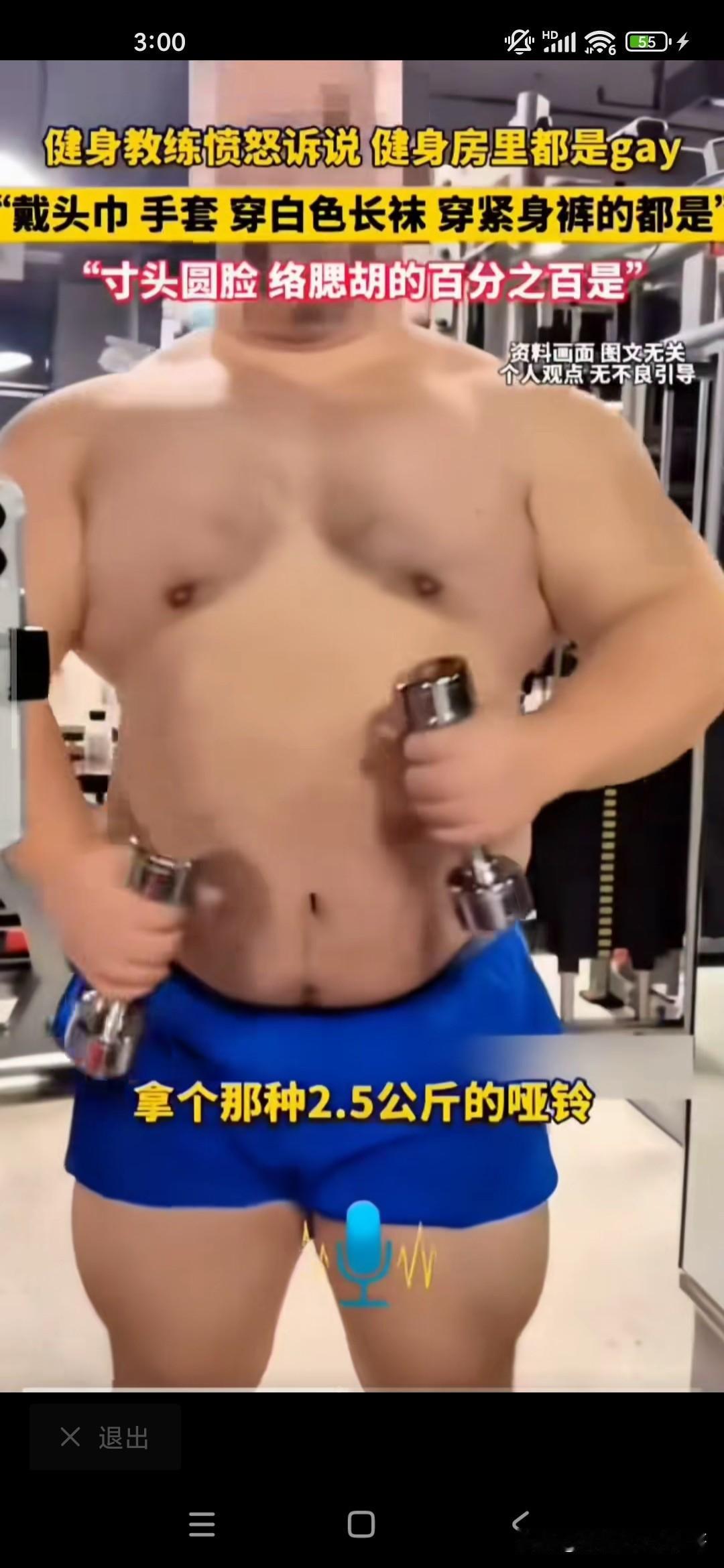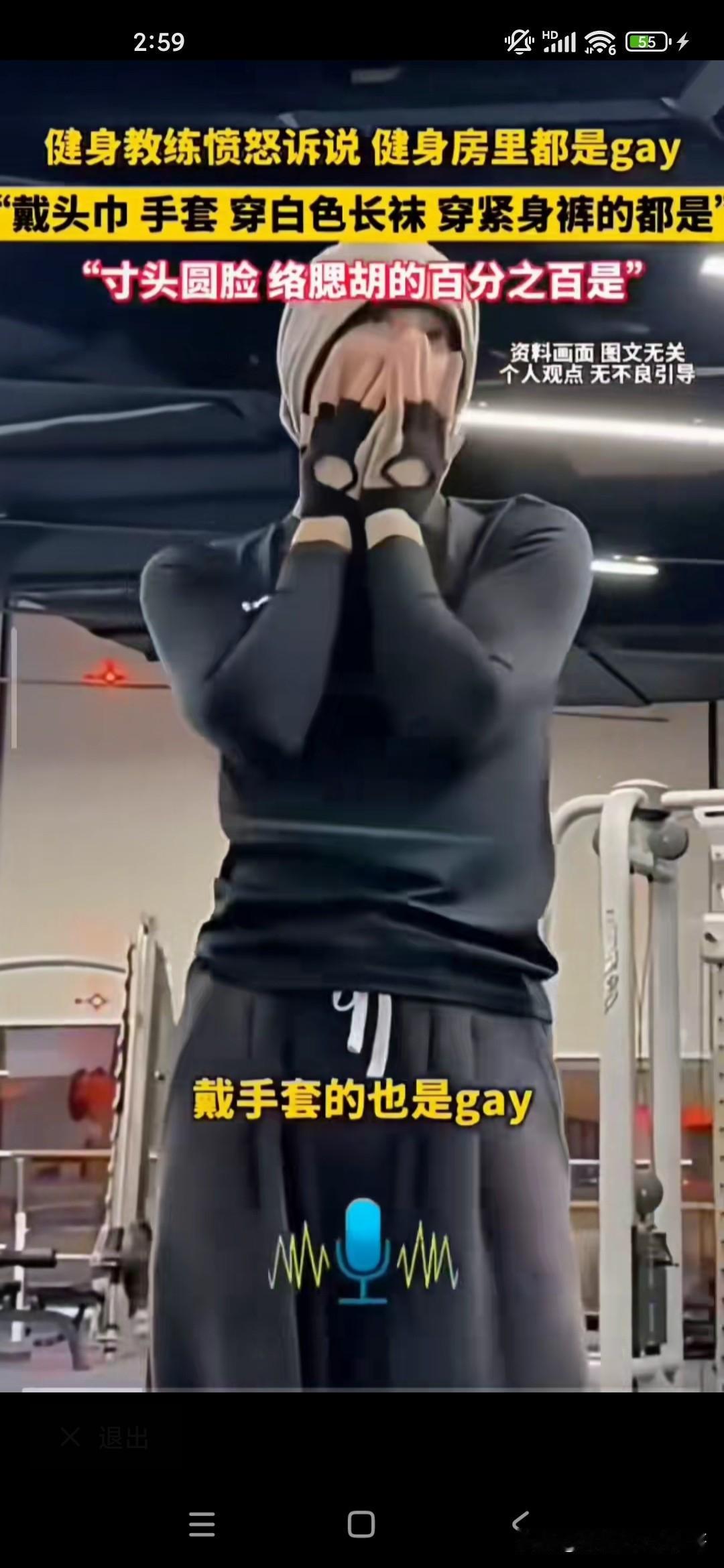想不到健身房里边儿有这么多的gay,gay也就是同性恋的意思,因为在健身房里工作多年的教练,他说这个gay的话就是男同性恋的话有很多特征,第一是络腮胡子,寸头;第二的话是经常拿着相机对着自己的臀部不停的欣赏和自拍的;第三是喜欢穿紧身裤和瑜伽裤的;第四的话是袜子很长很白的;第六的话是拿着身身材很健硕,但是却拿着2.5kg的哑铃在那挥来挥去的;第七戴头巾的,戴头巾的;第八的话是带手套的,总而言之,他似乎看到健身房的很多都是gay,他都感觉到特别讨厌,也可能是同性排斥吧,我不知道你去健身房健身的时候有没有这样的感觉!