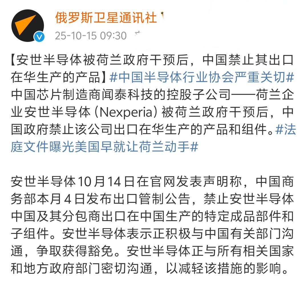 荷兰冻结安世半导体资产后,中国禁止出口安世中国生产的部件和组件。这就意味着荷兰安