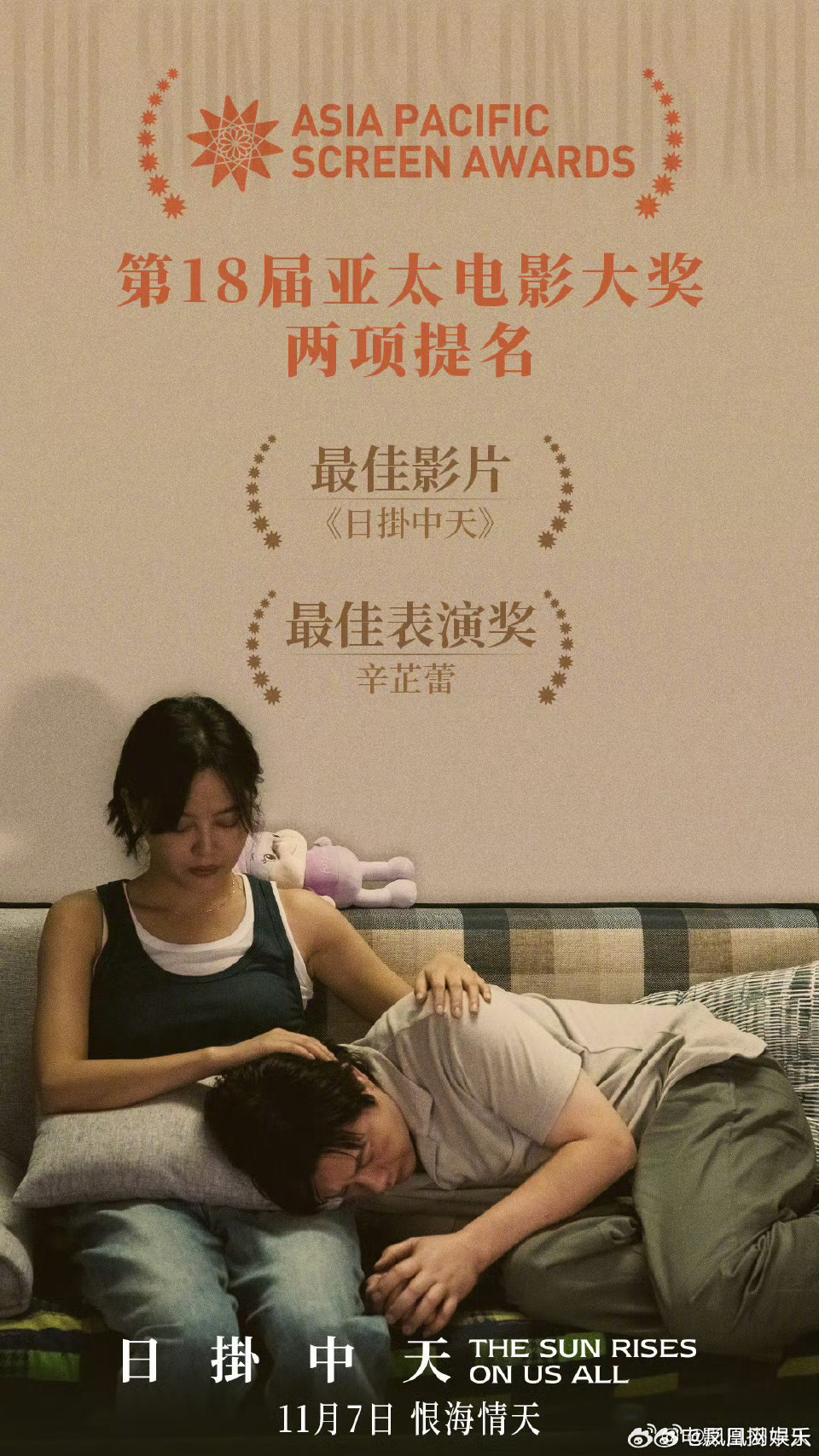 辛芷蕾提名亚太电影大奖辛芷蕾又提名一个国际大奖演员凭借电影《日掛中天》“美云”一角提名第18届亚太电影大奖“最佳表演奖”,这也是辛芷蕾继9月6日获第82届威尼斯国际电影节最佳女演员奖后,两个月内收获的第二项国际顶级奖项认可。同时,《日掛中天》也提名为“最佳影片”,该片将于11月7日正式上映。