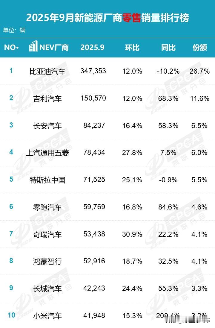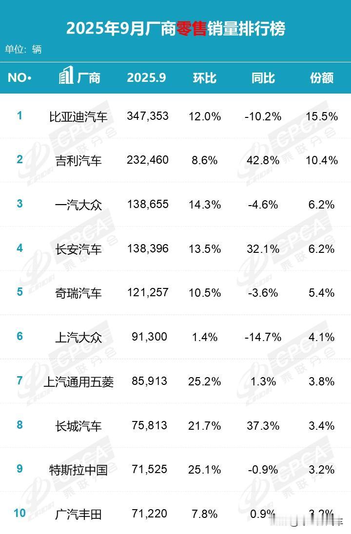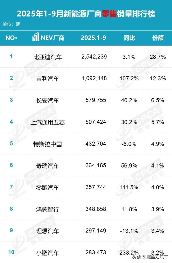 9月、1-9月汽车厂商销量榜/新能源汽车厂商销量榜出炉!吉利汽车销量同比大增,新能源汽车月销超4万辆才能进入前十,竞争越来越激烈了,淘汰赛加速到来!