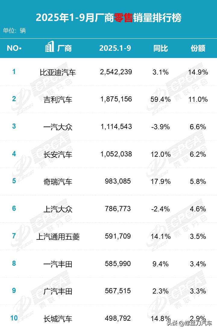 9月、1-9月汽车厂商销量榜/新能源汽车厂商销量榜出炉!吉利汽车销量同比大增,新