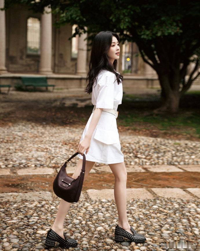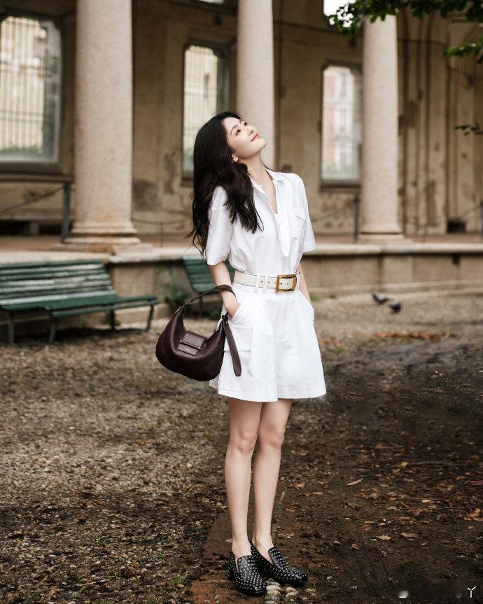 白鹿极简白裙杀白鹿极简九宫格极简风白裙搭配复古感包包,在欧式建筑与绿意间穿梭,