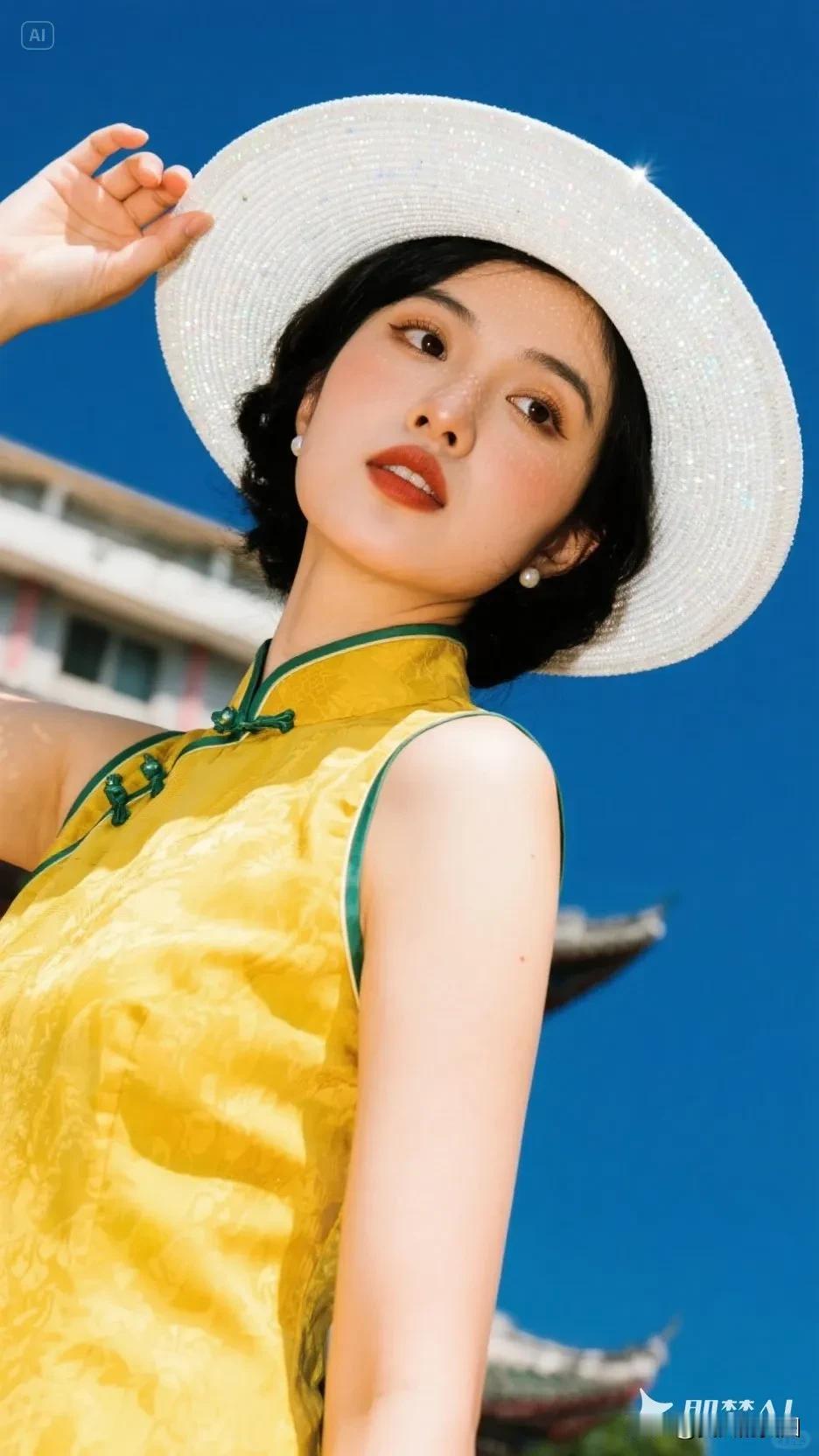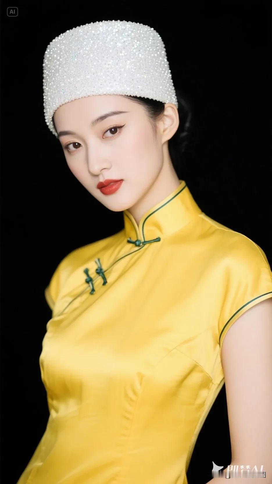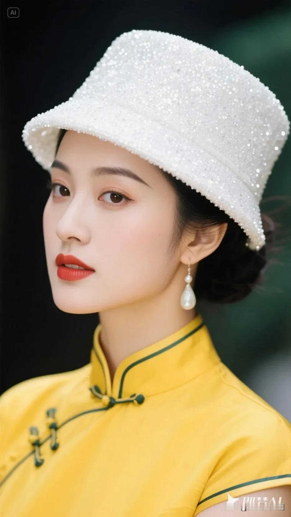 黄色帽子的旗袍美人,微笑美极了!