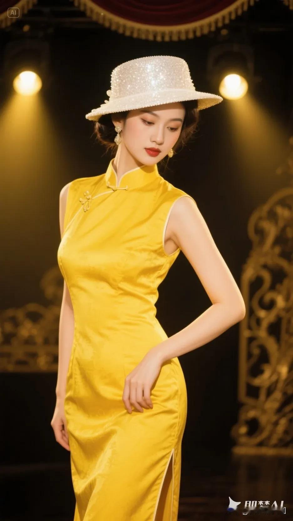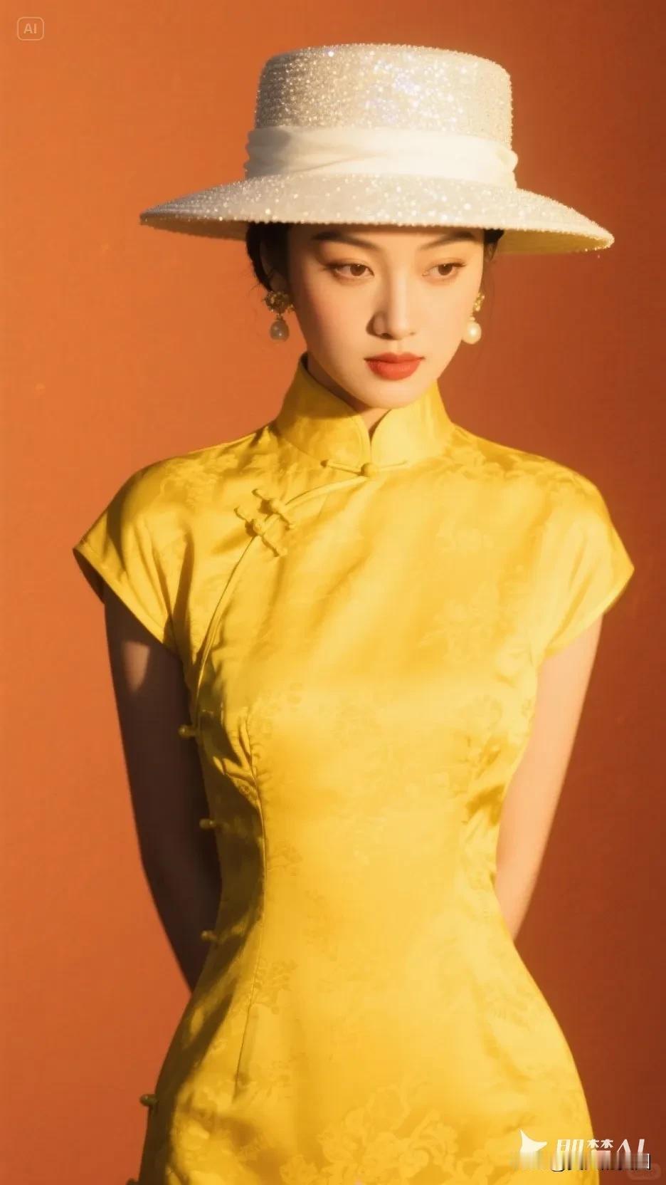 白色帽子的黄色旗袍美人(195)