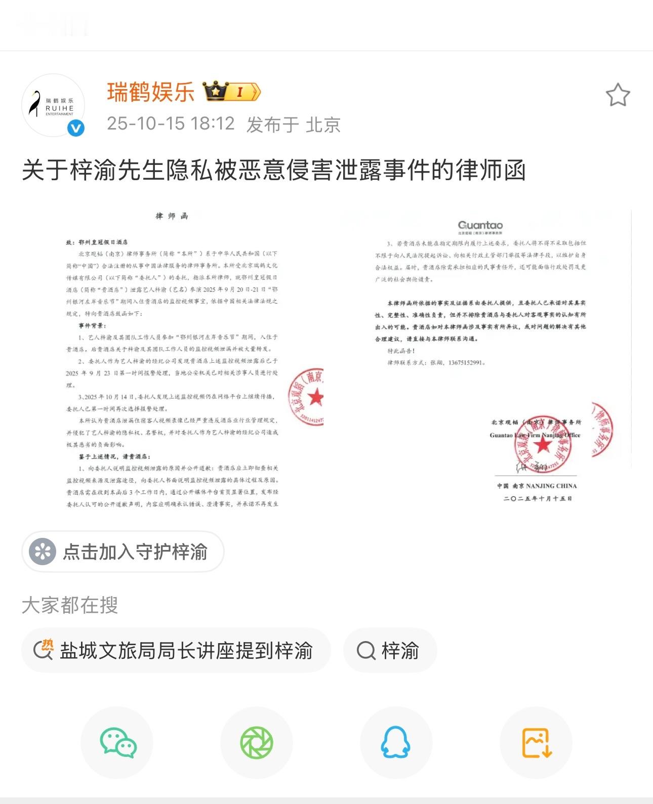 梓渝经纪公司瑞鹤娱乐发布律师函,就梓渝先生隐私被恶意侵害泄露事件做了完整的叙述与对酒店的要求: